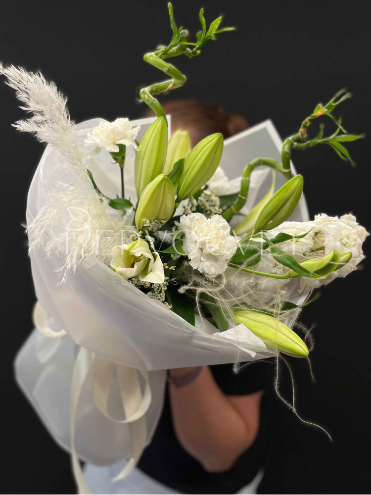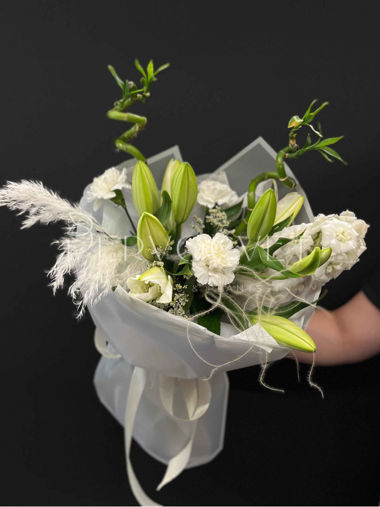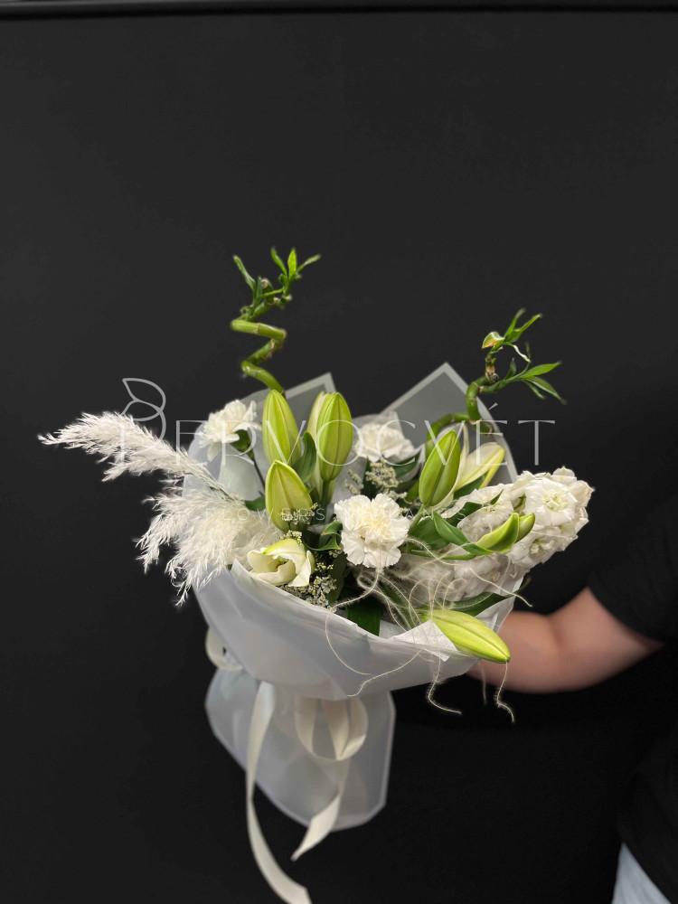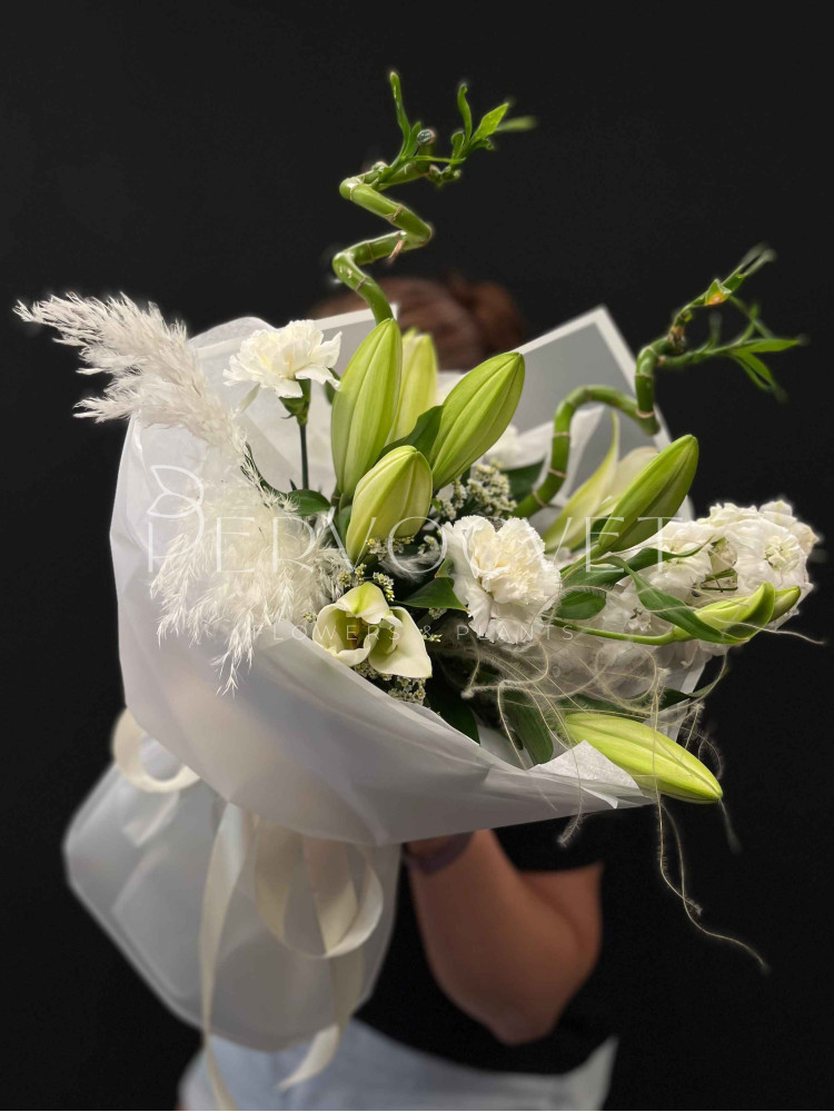 Авторское стильное творение наших флористов - букет с белой лилией и "бамбуковыми" ветками драцены Сандера. Смелое сочетание, в стильный интерьер для красивых фото, которое будет долго радовать получательницу в домашней вазе: стойкие диантусы, дельфиниум, ароматные бутоны лилии и сухоцветы в оттенках белого. Шикарный монохромный букет с уникальной зеленью!