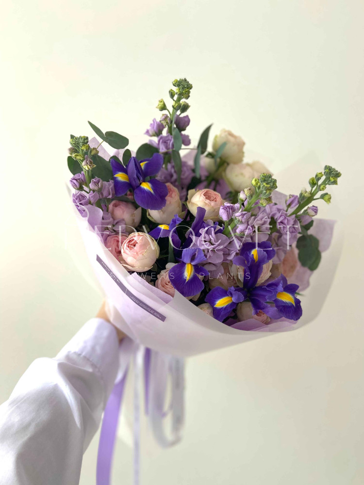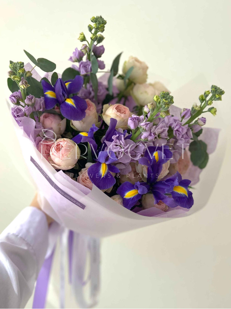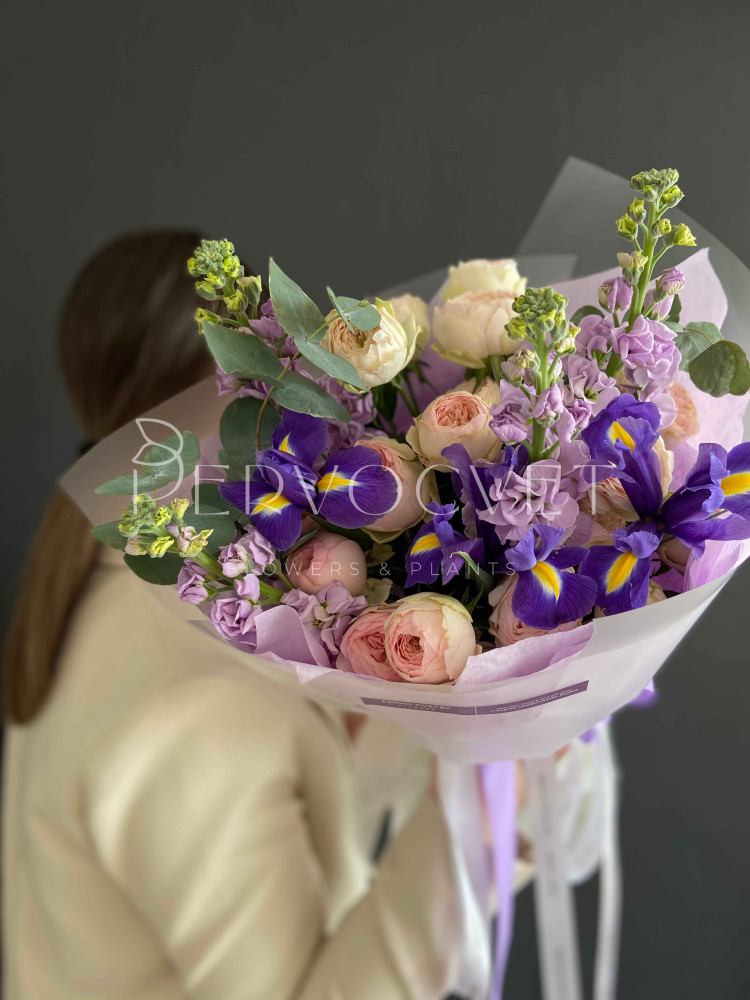 состав: маттиола, ирис, кустовая пионовидная роза Месфилд Парк, эвкалипт