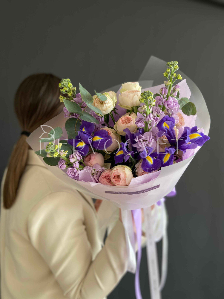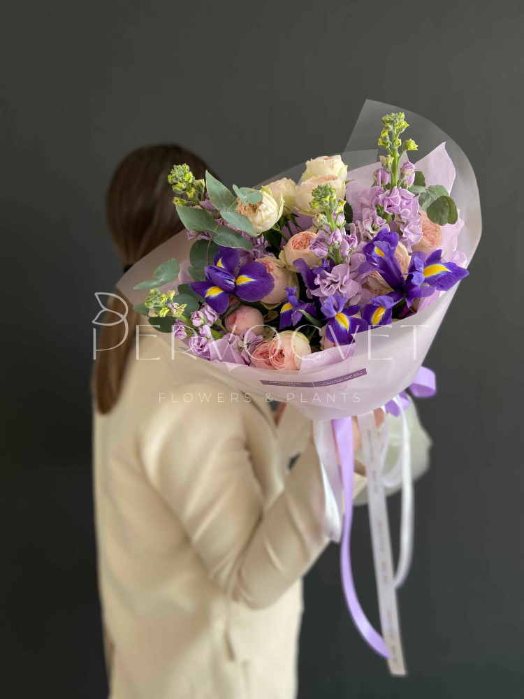 Букет в нежный розово-сиреневых оттенках, с ароматной маттиолой, кустовыми пионовидными розочками сорта Менсфилд Парк и синими ирисами. Весеннее ароматное сочетание в красивой цветовой гамме.
