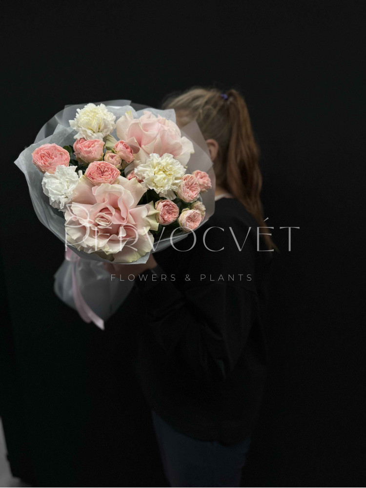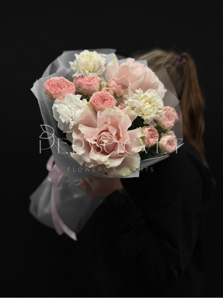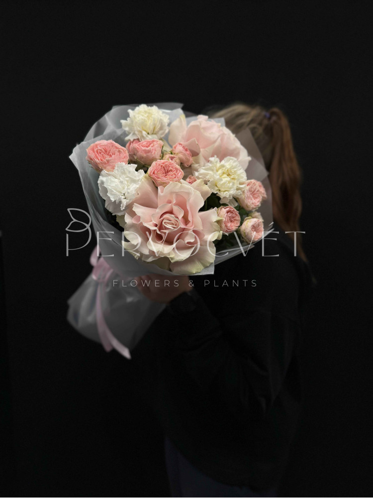 Многослойные фактуры пионовидных многочисленных роз, французской нежной розовой розы и ароматных гвоздик. Пышный букет, в котором видно каждый цветочек в стильной матовой упаковке!