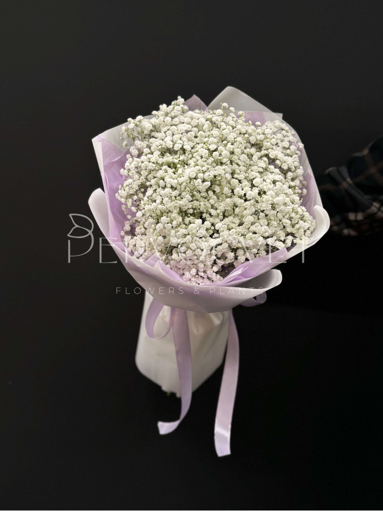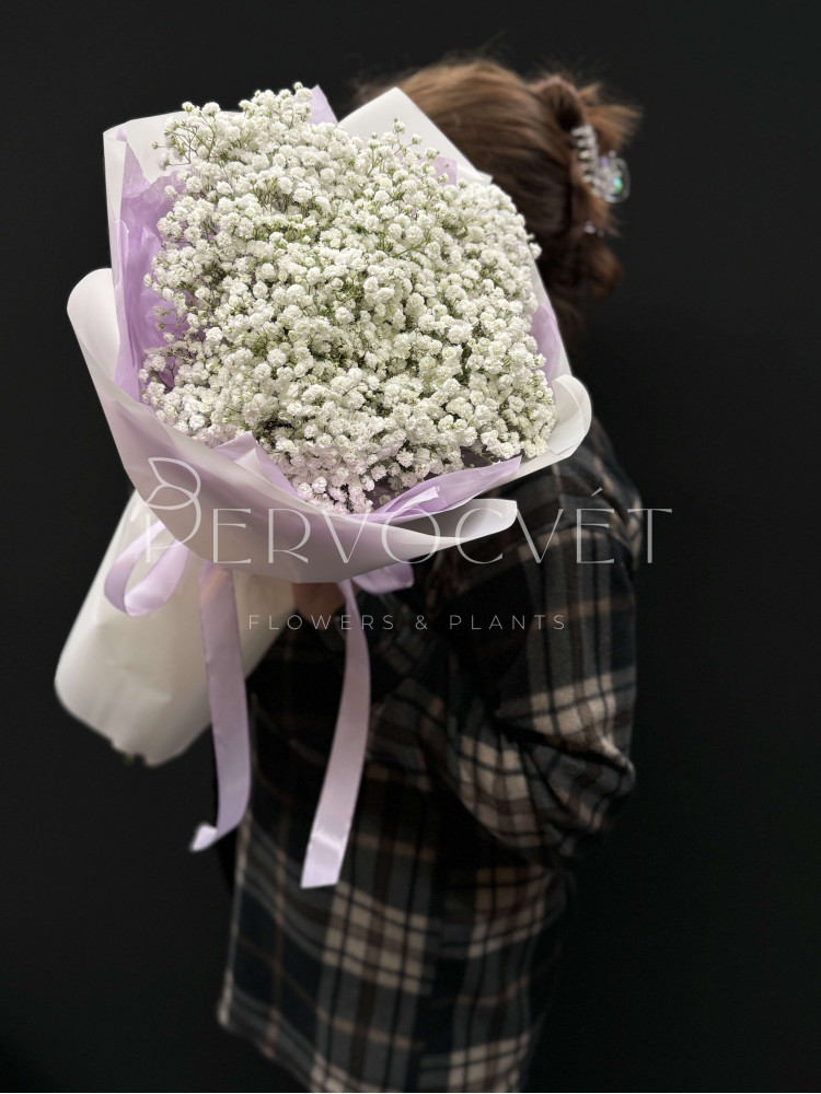 Нежное "облако" - букет из белой гипсофилы. Самый трогательный моно-букет из всех: многочисленные белоснежные цветочки в пышной стильной упаковке.