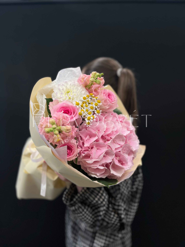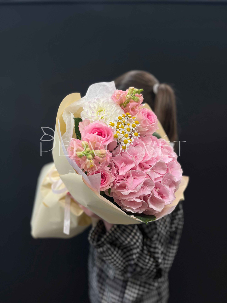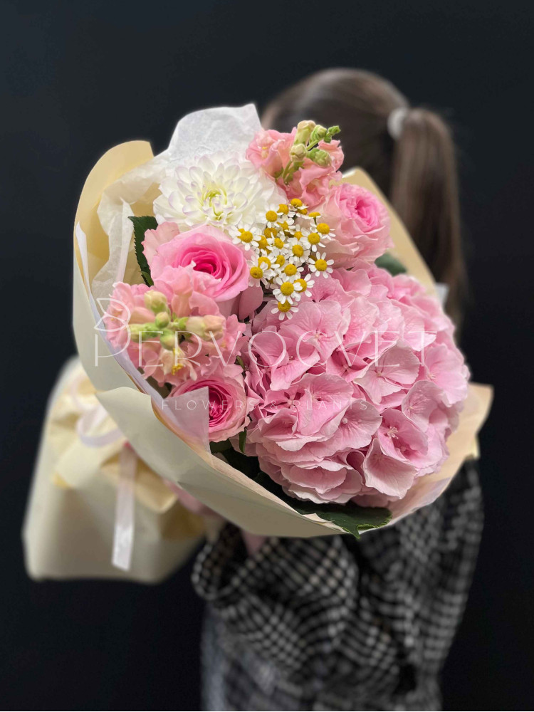 Свежее летнее сочетание гортензии, георгина и роз, с ромашкой танацетума и акцентными розовыми антирринумами. Пышный букет в нежной упаковке, садовое сочетание в розовых оттенках.