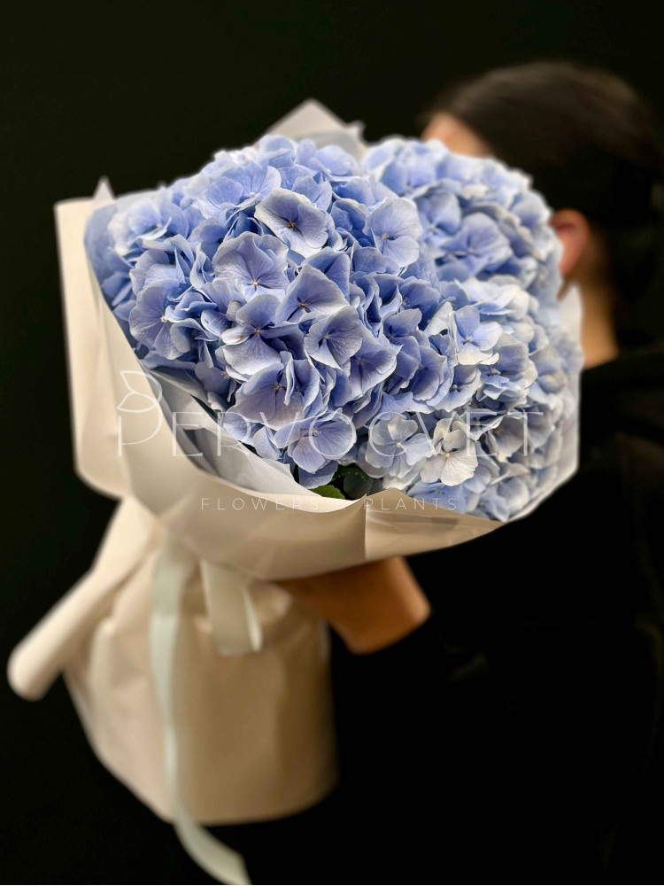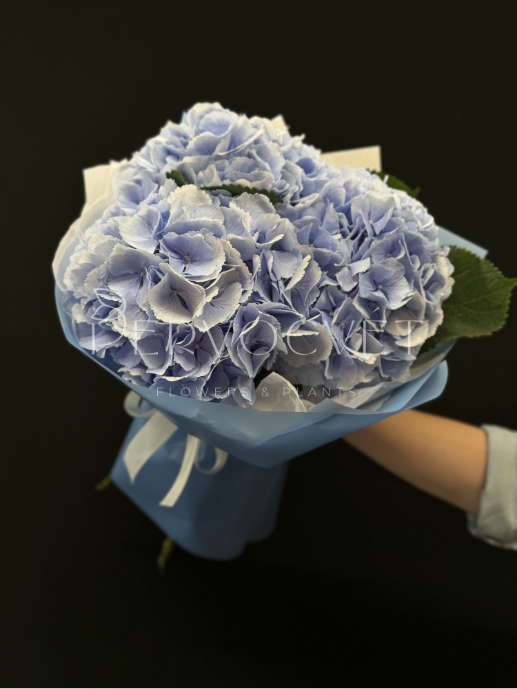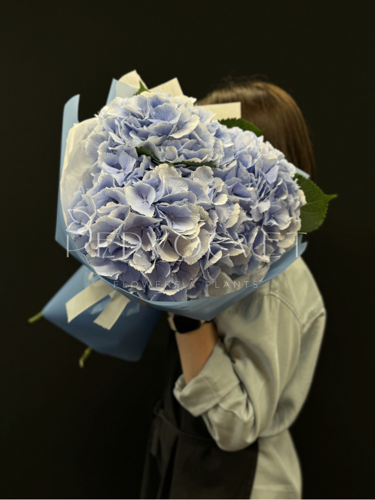 Моно-букет из голубых гортензий - самый редкий и популярный цветок голубого цвета. Шикарные "шапки" соцветий, красивый и стильный букет, который точно удивит и станет поводом для фотосессии!