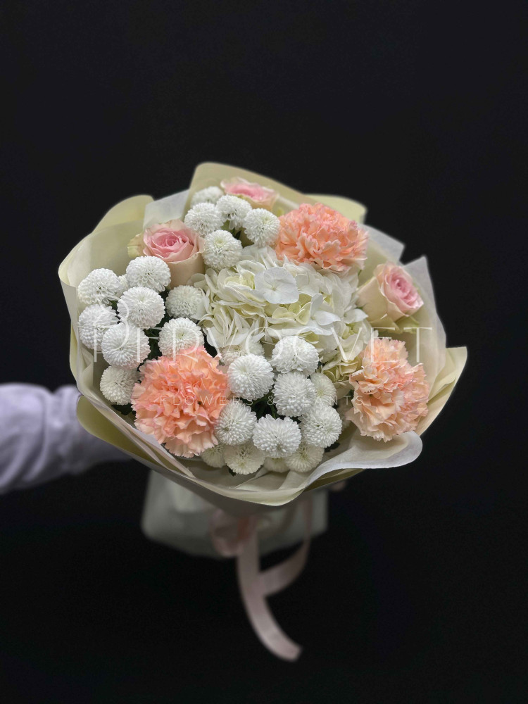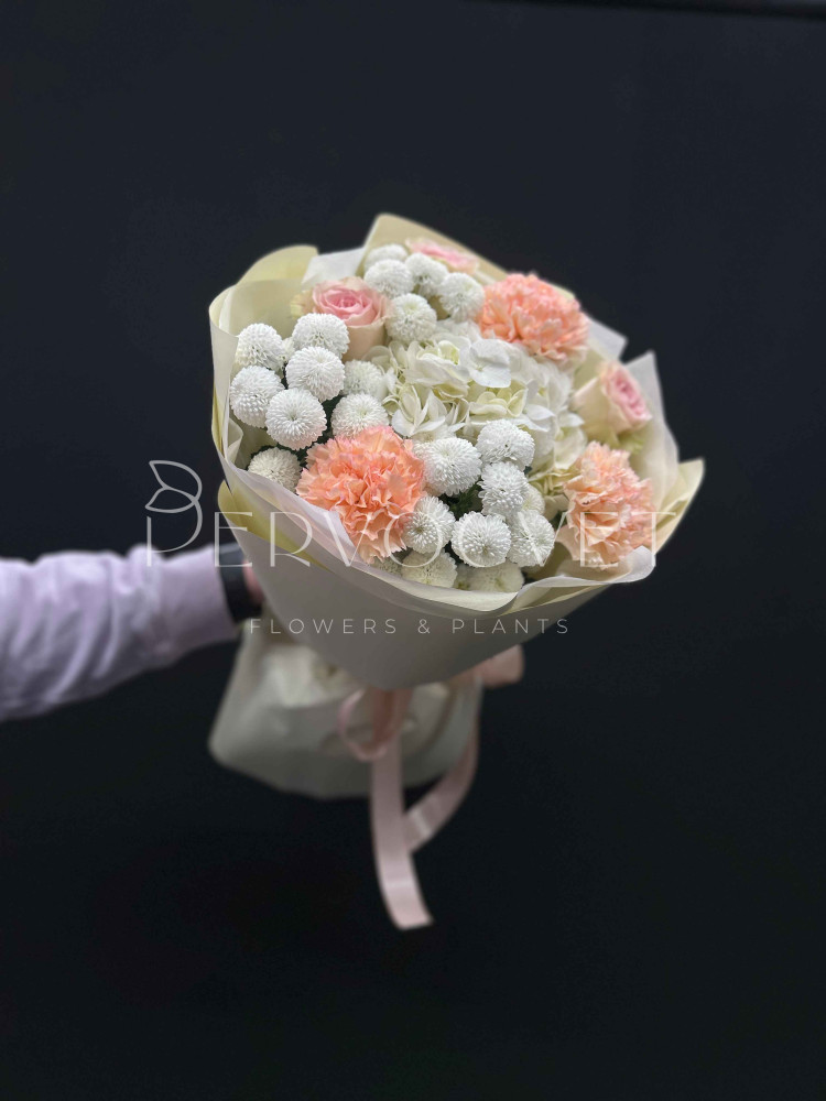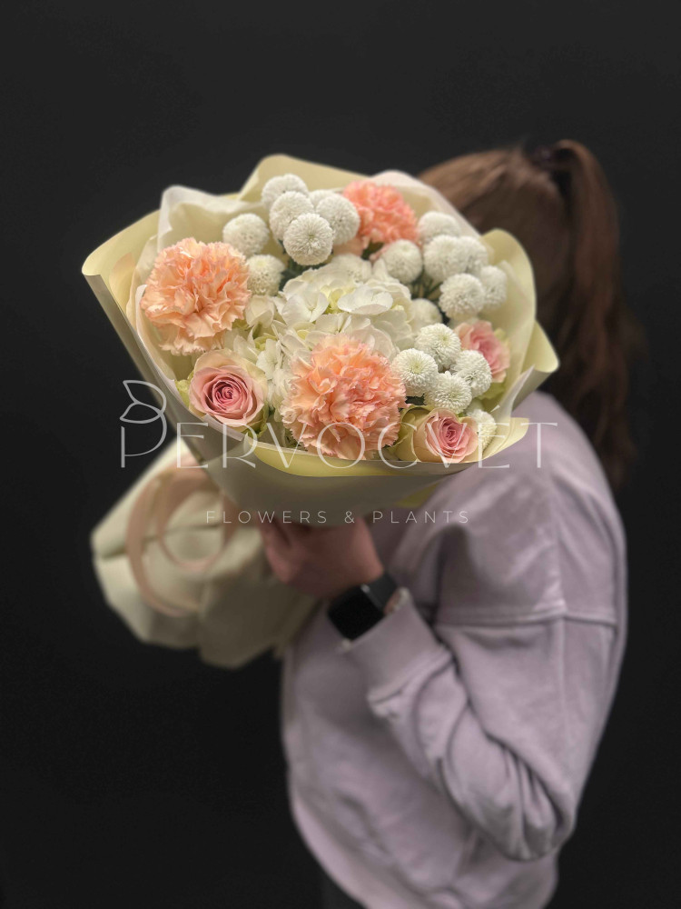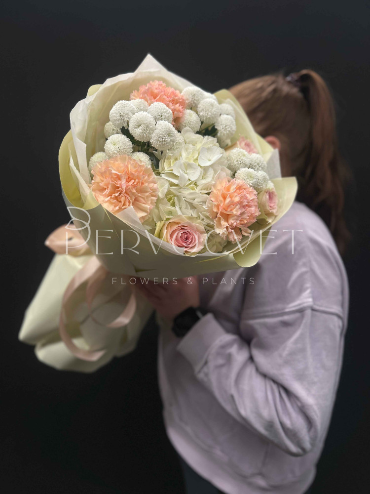 Букет с белой гортензией и фактурными диантусами (гвоздиками) в персиковом оттенке. Интересный микс разных фактур в светло-розовом-персиковом оттенке. Пышный букет деловой или для любимой - сочетание сада в любое время года !