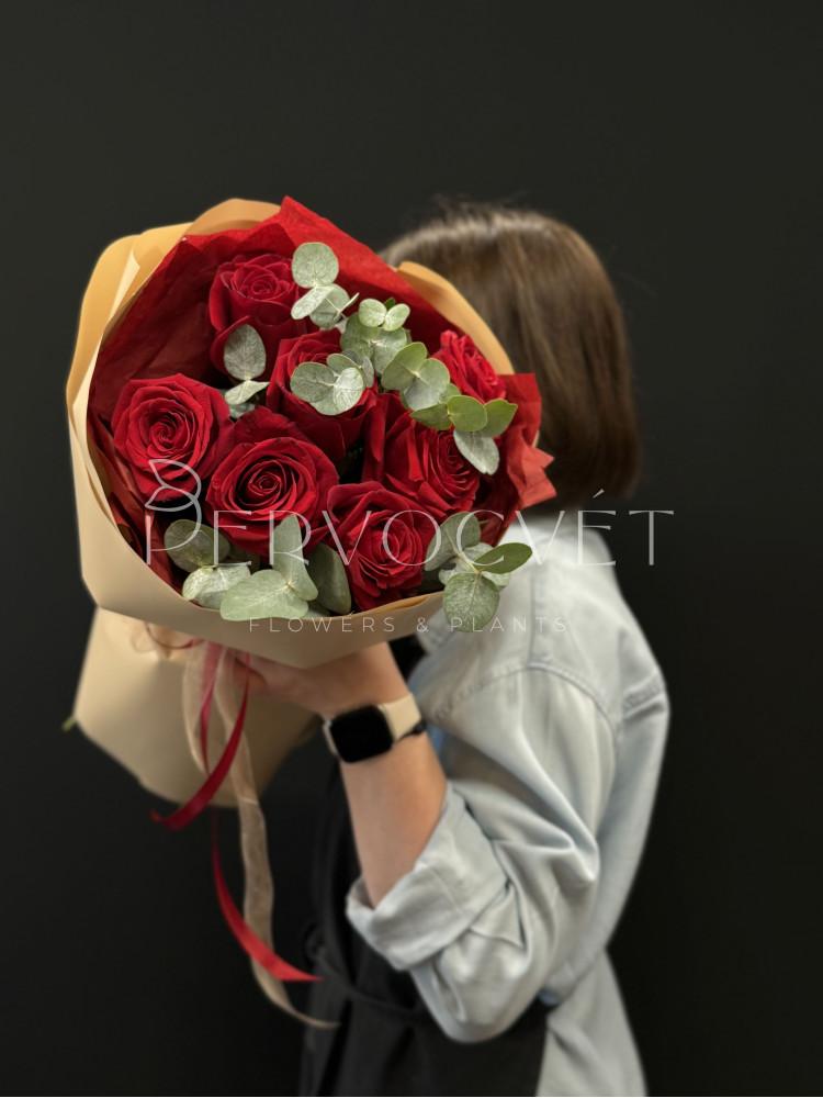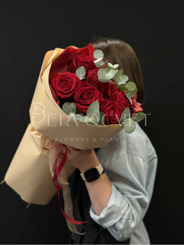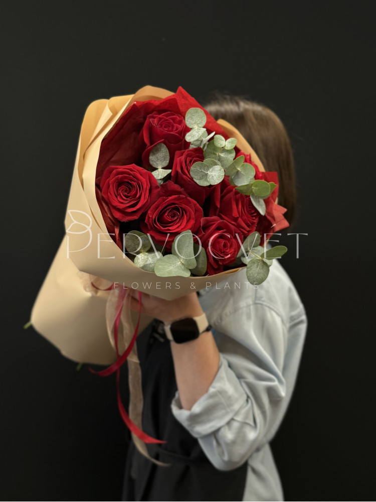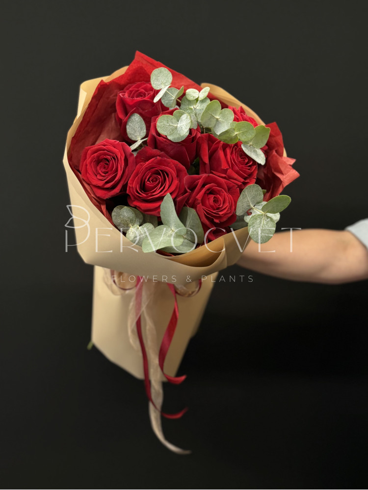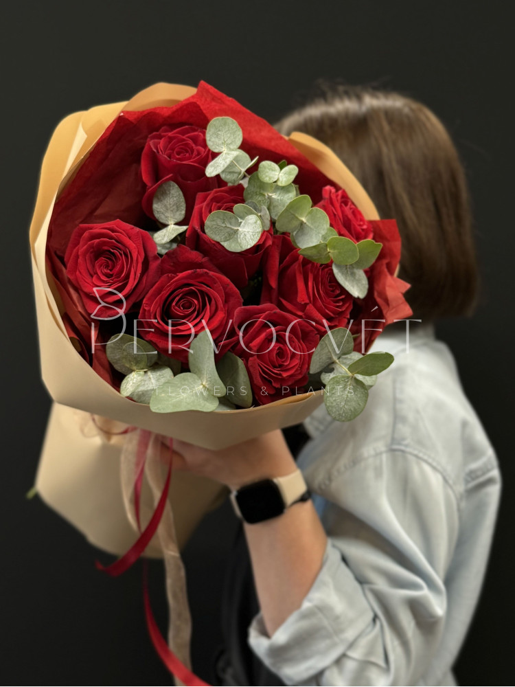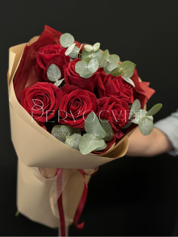 Стильная классика букета красных роз, дополненная зеленью эвкалипта. Стильная упаковка, розы Эквадор и красивая зелень. Пышный букет, подходящий для любого случая!