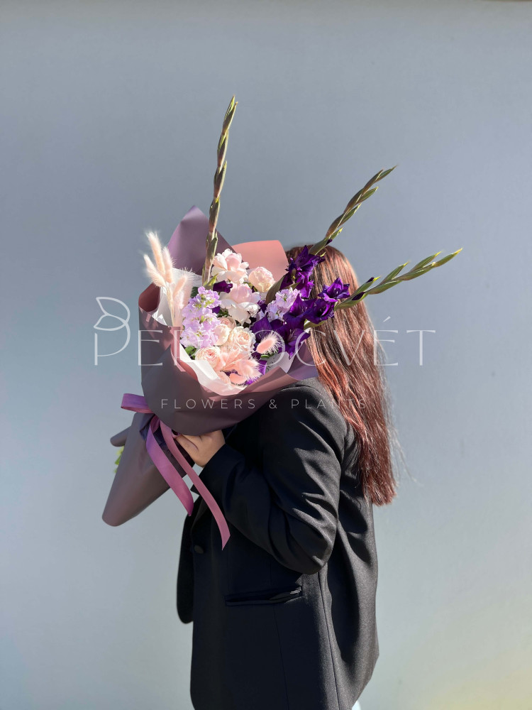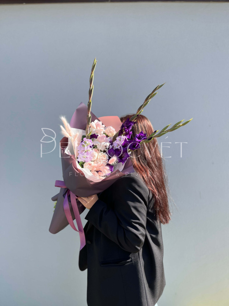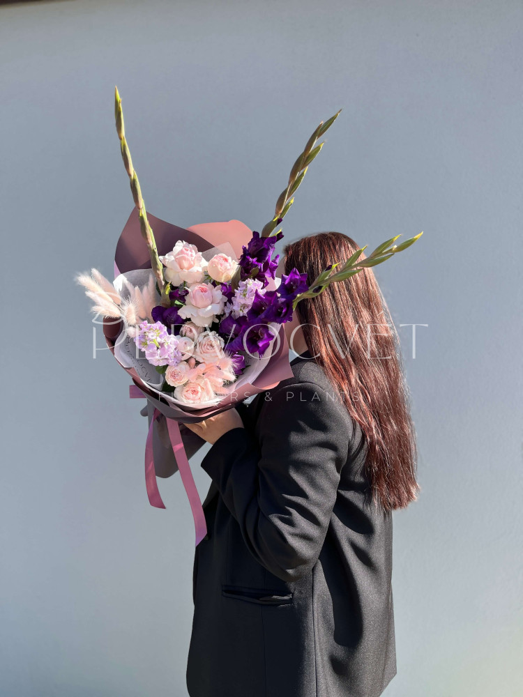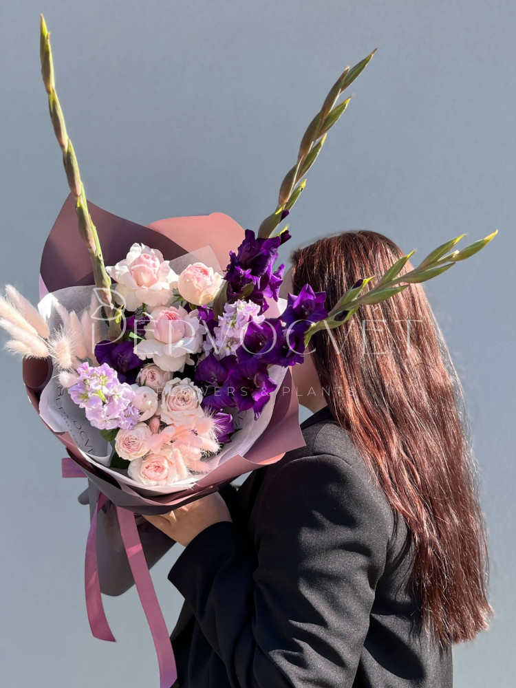 Пионовидная роза, ароматная маттиола и акцентный гладиолус - самое нежное, самое ароматное и сезонный акцент. Идеальная концепция для подарка с эффектом ВАУ!