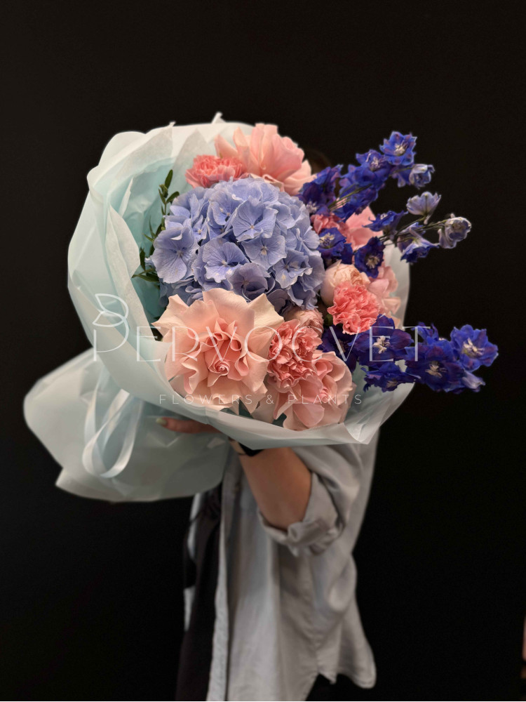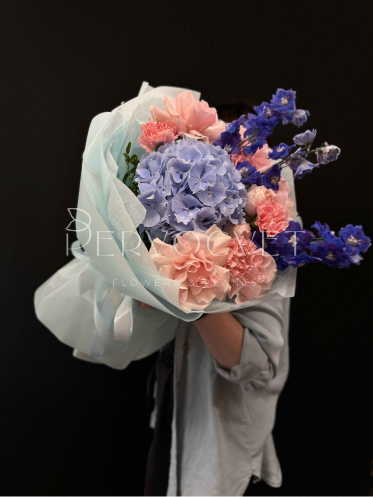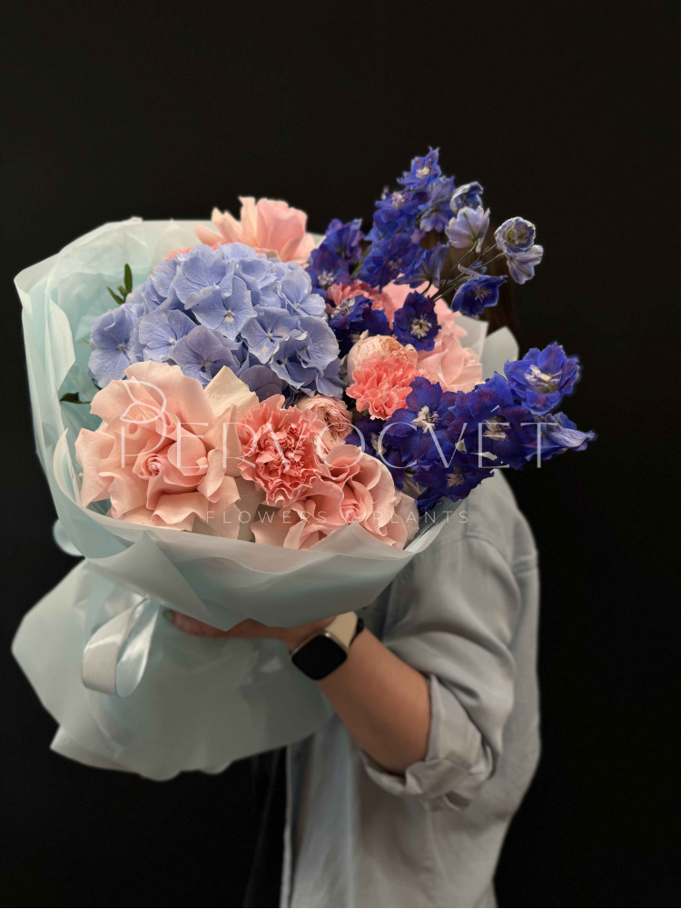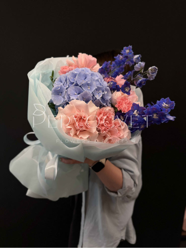 состав: гортензия, дельфиниум, французская роза, гвоздика, кустовая пионовидная роза Менсфилд Парк, фисташка (техническая зелень)