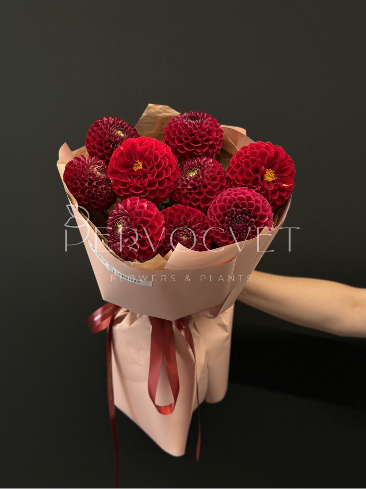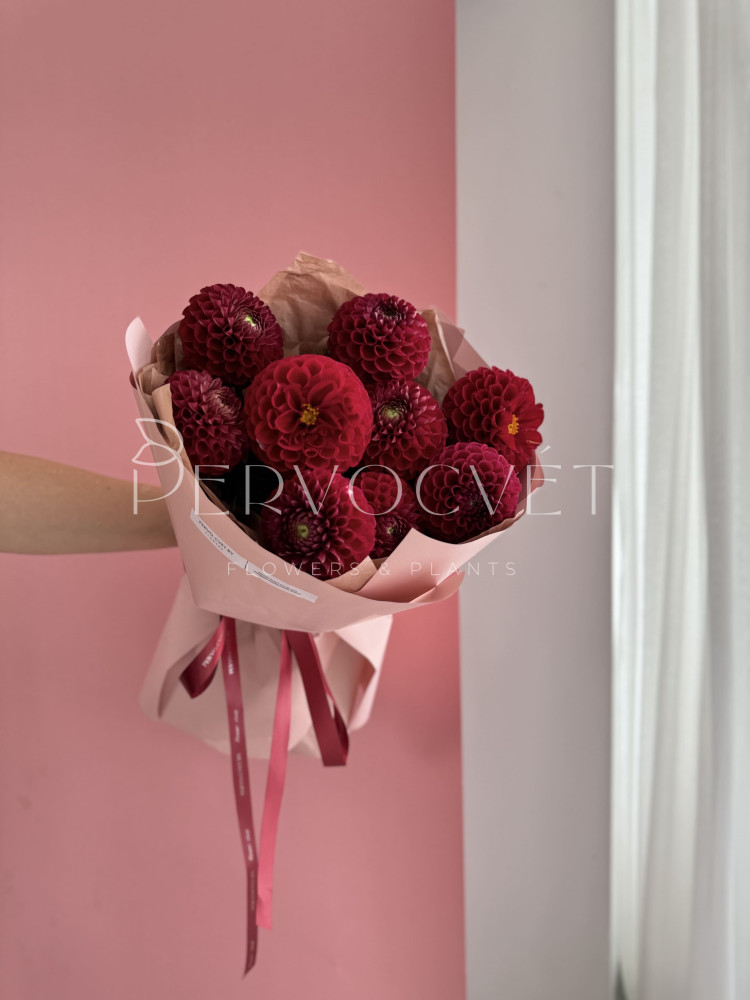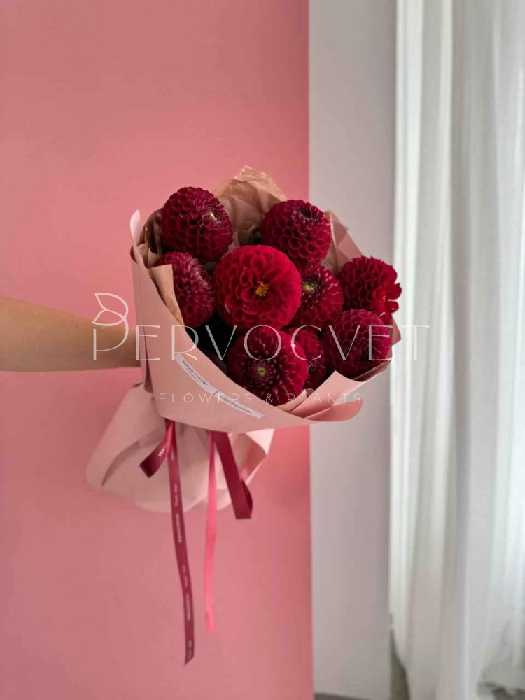 Яркие георгины красно-винного оттенка - сочные идеальные стойкие шарики в стильной упаковке!