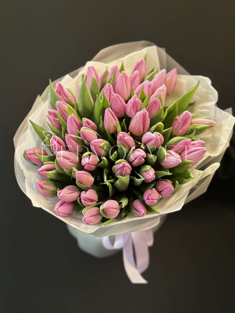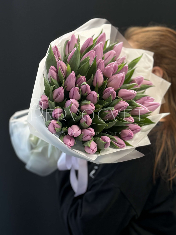 Букет из сиреневых, лавандовых тюльпанов в пышном оформлении - мечта всех девушек! Уникальный оттенок, весенние первоцветы - удивляйте своих любимых дам.