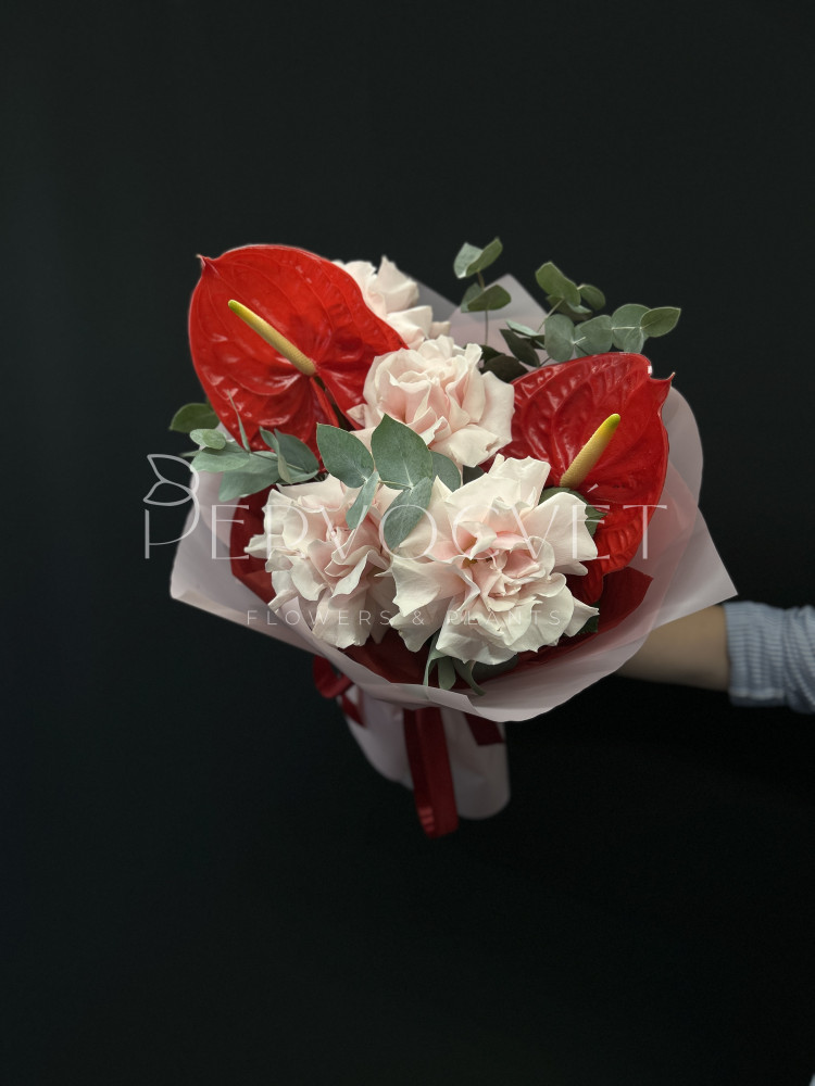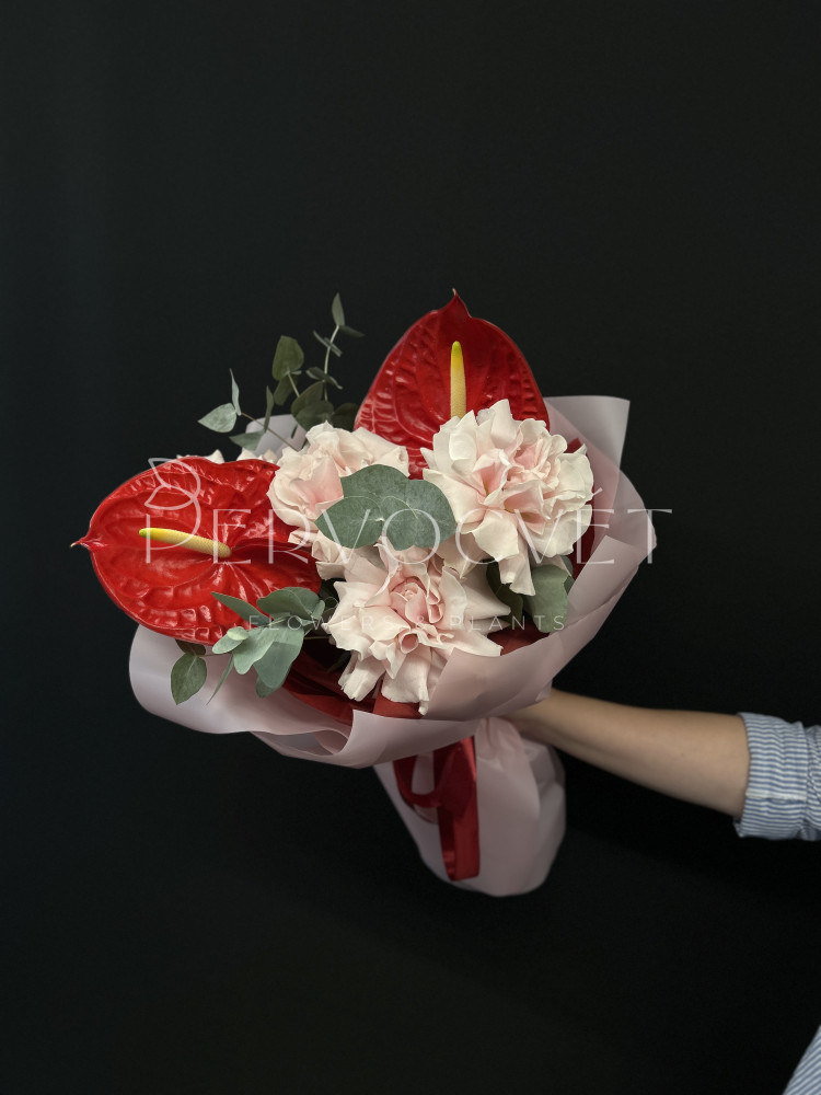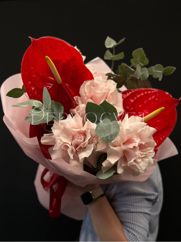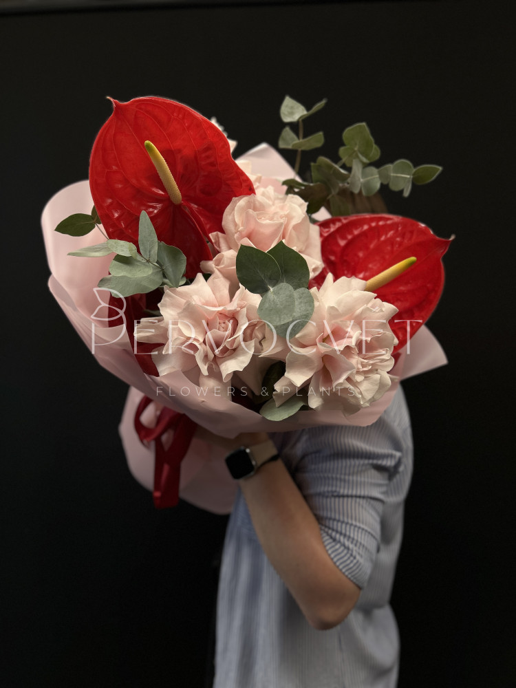 Такие разные фактуры, но как идеально дополняют друг друга! Нежная французская роза Пинк Мондиаль и яркий красный антуриум - частый выбор для стильных букетов. А вместе, соединенные зеленью серого эвкалипта руками наших флористов - это идеальное сочетание для современного букета из двух компонентов.