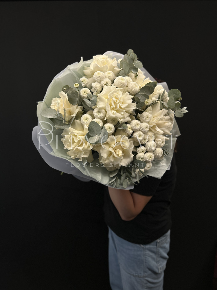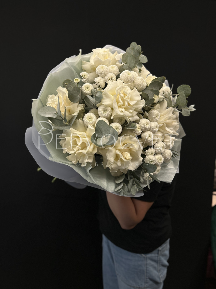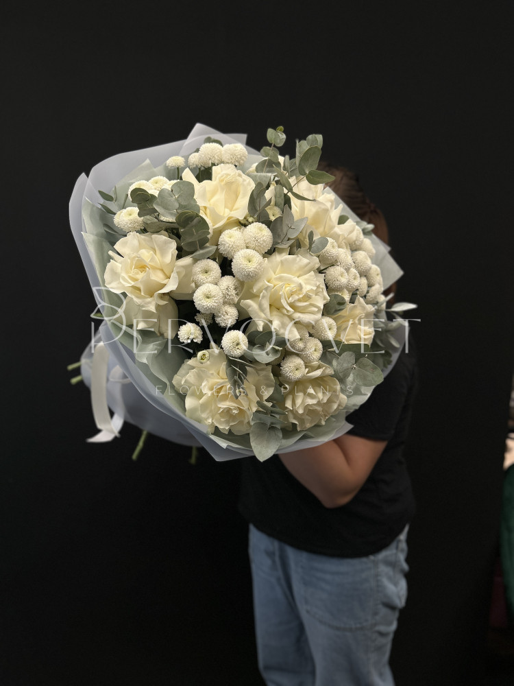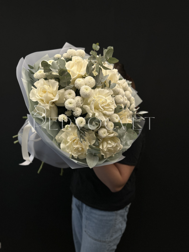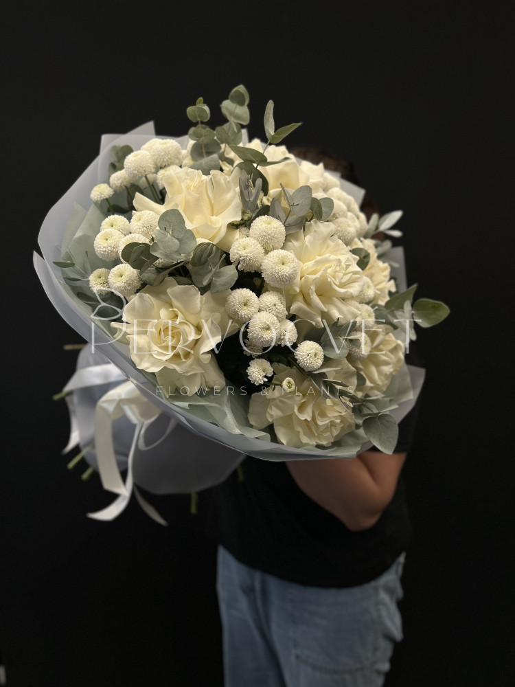 Микс двух разных фактур: нежная и вуальная французская роза и кустовая хризантема с многочисленными цветочками. Белоснежный букет с зеленью эвкалипта в пышном оформлении - стильный монохром, который интересно рассматривать!