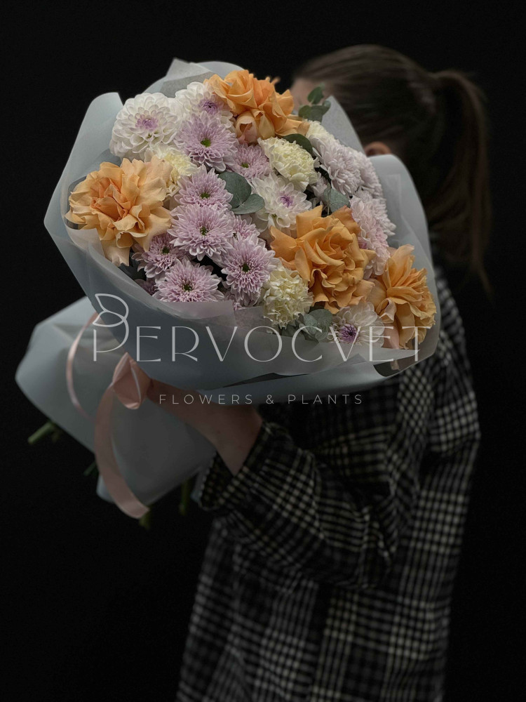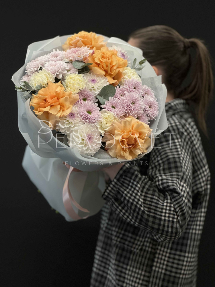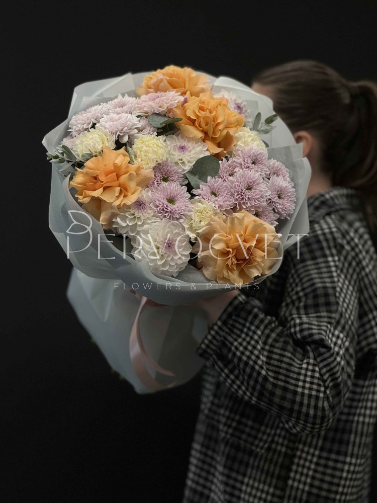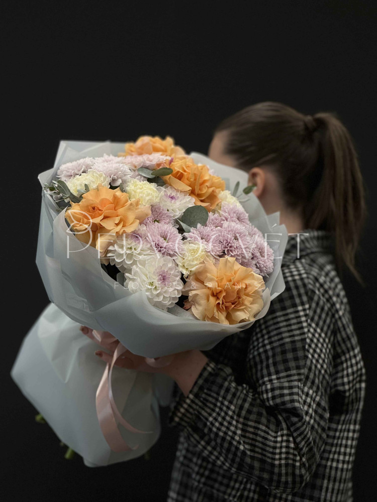 состав: хризантема 3, французская роза 4, георгин 5, гвоздика 4, эвкалипт