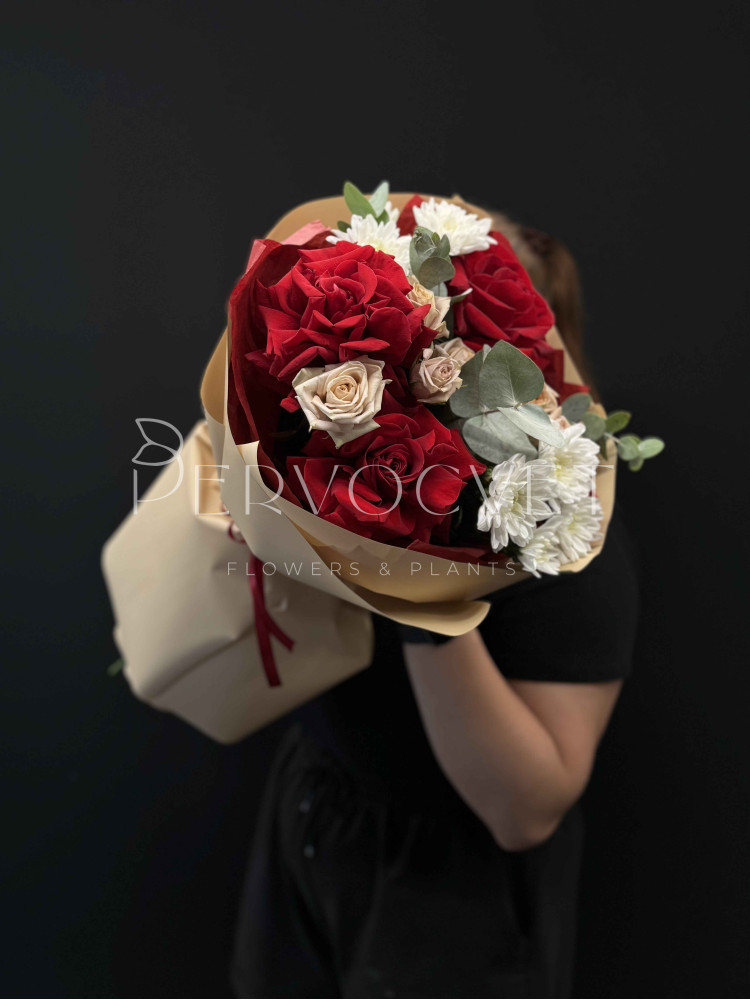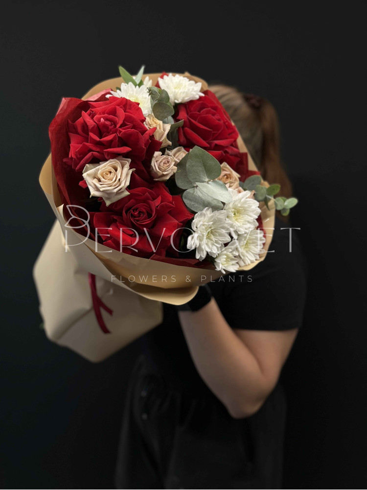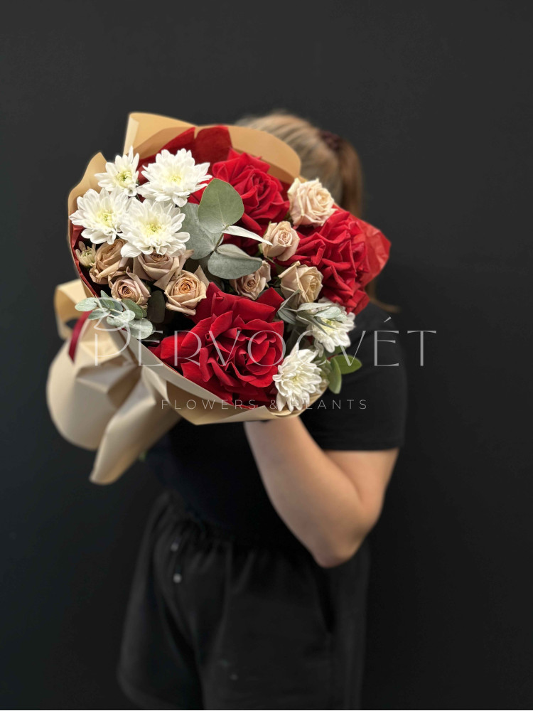 Розы и хризантема в современном сочетании и стильном оформлении рук наших флористов: французская красная роза сорта Фридом, кустовая роза в персиково-кремовом оттенке и белая пушистая хризантема. Яркий букет, свежих и интересных сортов - для любого повода!