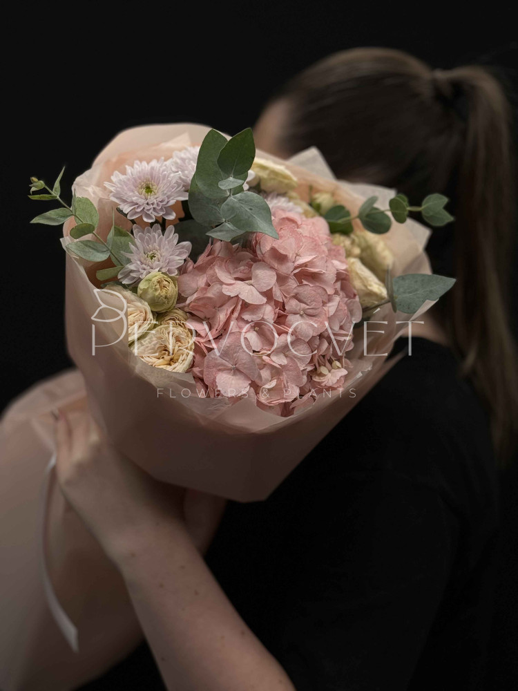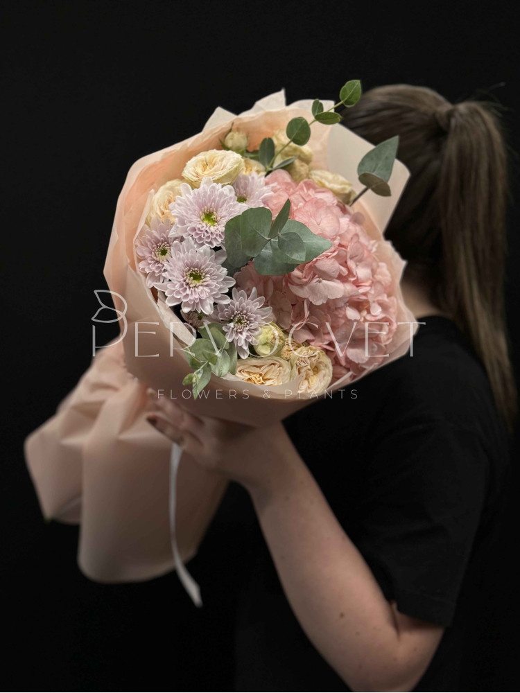 Нежный букет в пастельных оттенках с колумбийской гортензией, пионовидными кремовыми розами Джентл Трендсеттер и сиреневой хризантемой. Красивый микс разных фактур в пышном оформлении.