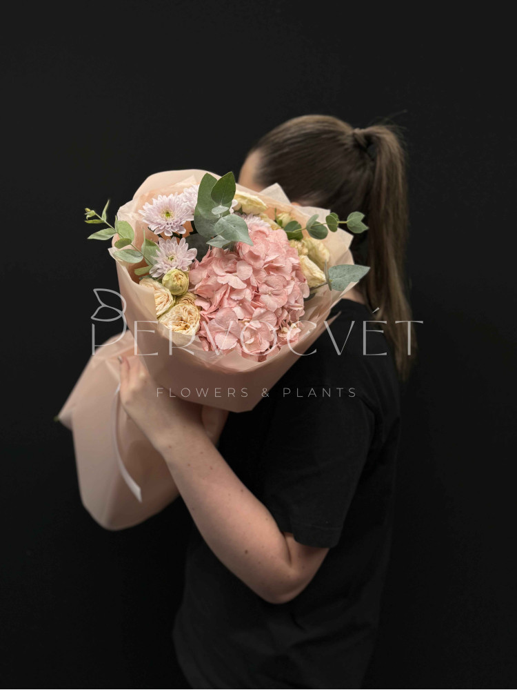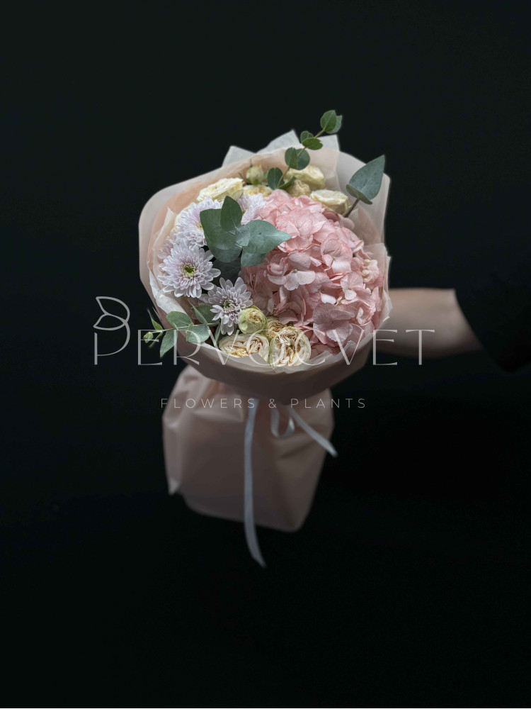состав: гортензия Колумбия, кустовая пионовидная роза Джентл Трендсеттер, хризантема, эвкалипт