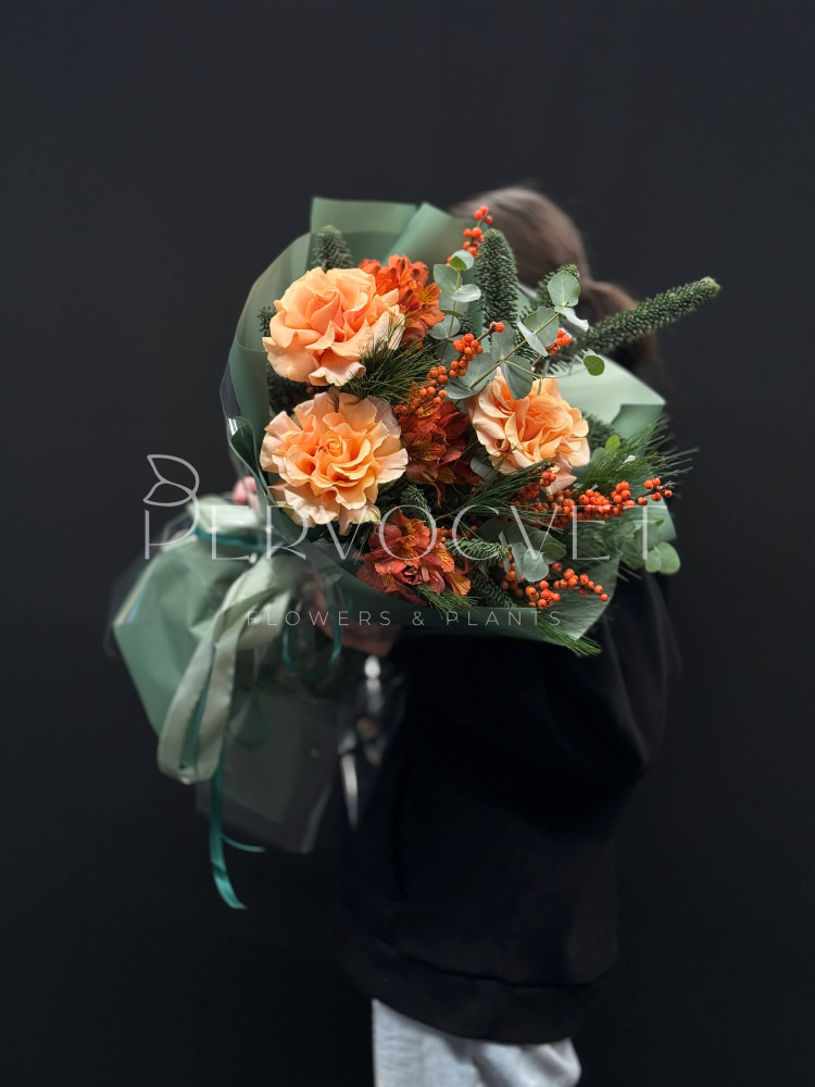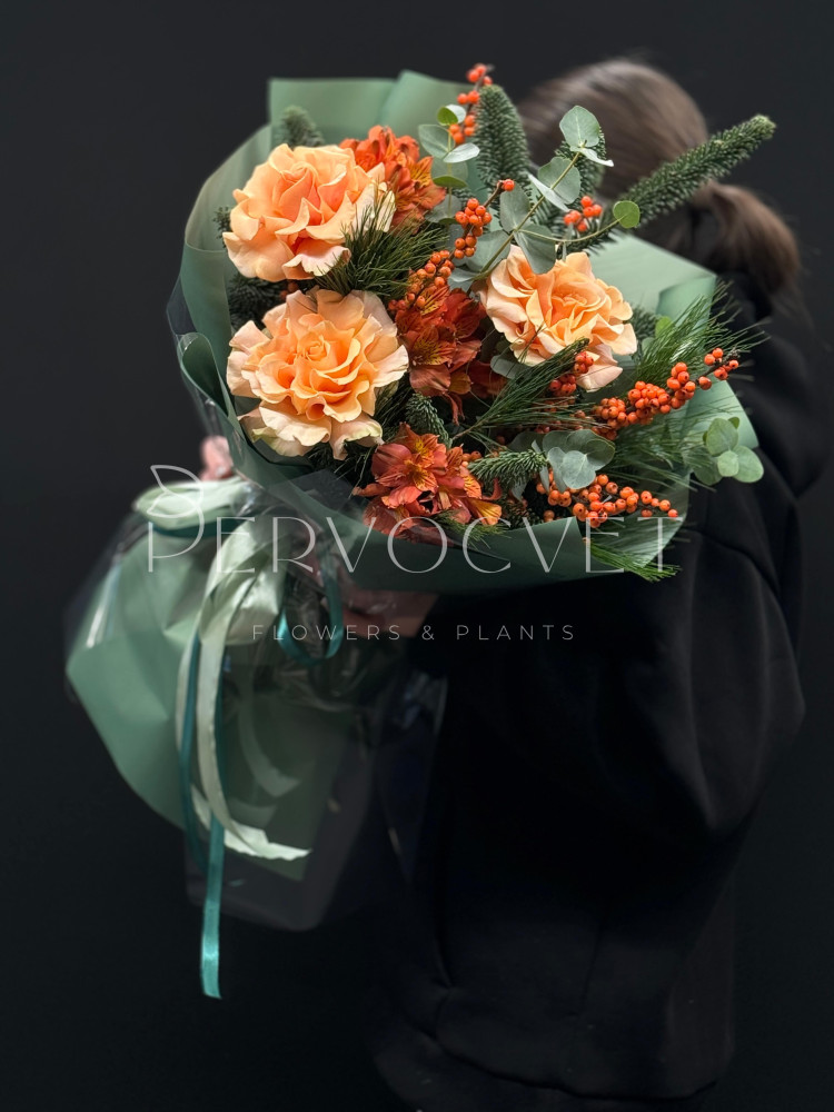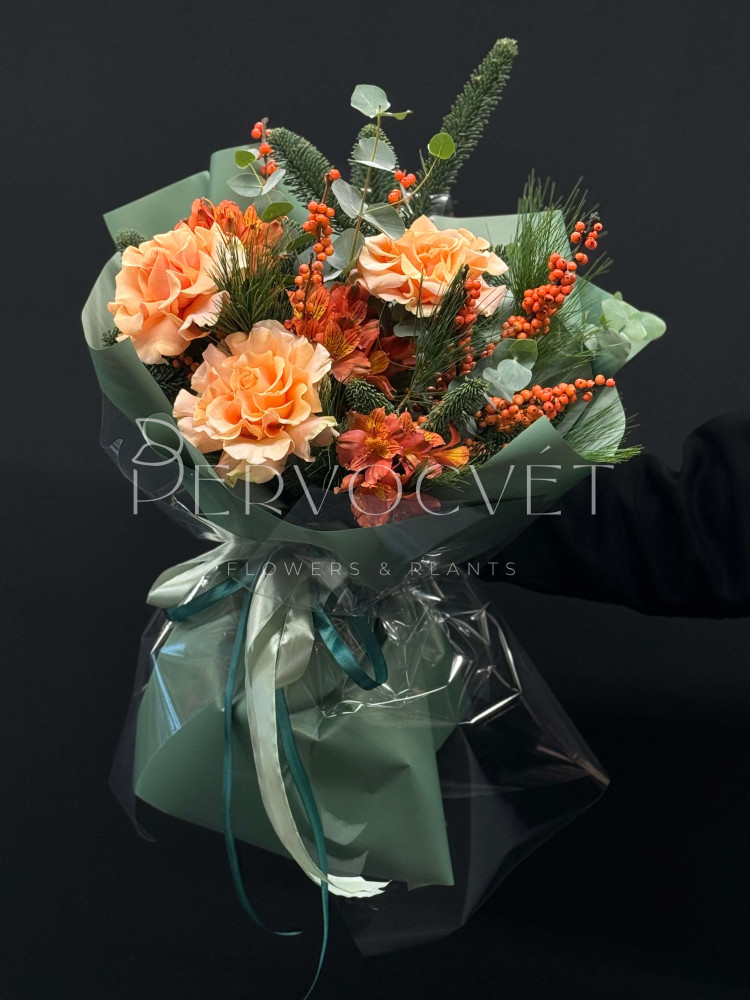Насыщенный и праздничный букет с хвоей Нобилис и сосной, яркой оранжевой альстромерией и редкой французской розой, сформированной бережно руками наших флористов. Конечно, дополнение ягод зимнего иллекса, чья сезонность очень ограничена, а оранжевый оттенок очень редкий!