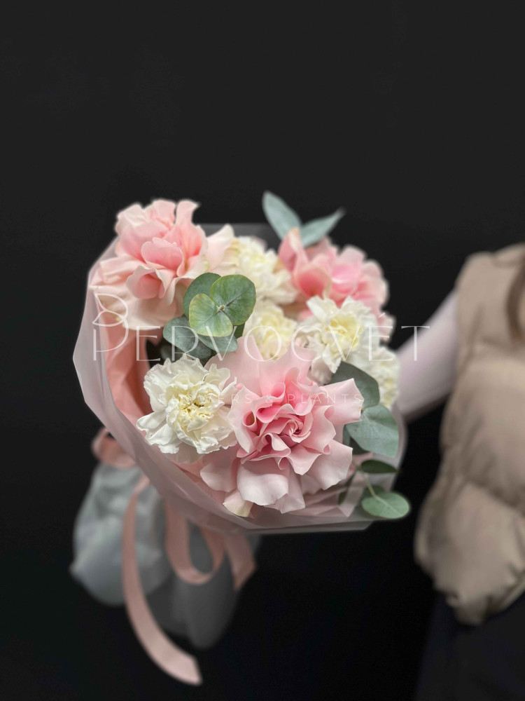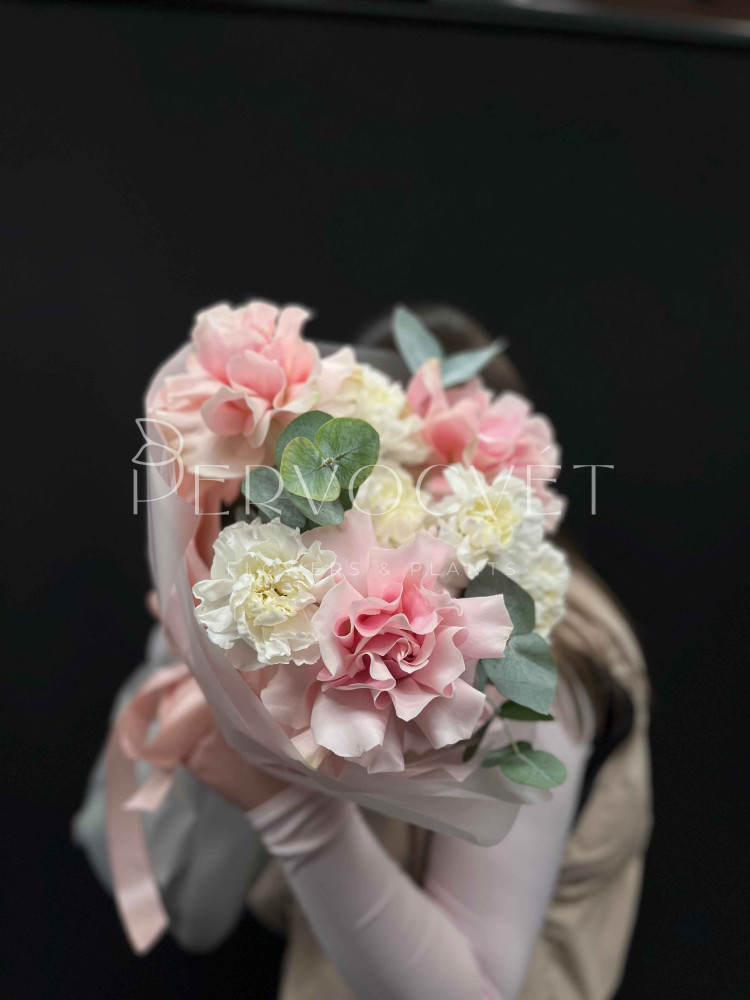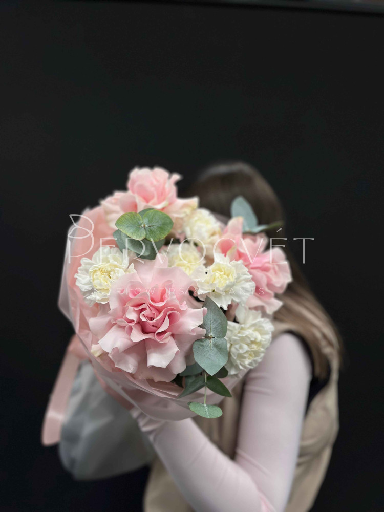 Любимый сорт французской розы и ароматный белый диантус - нежнее не бывает! Пышный букет с зеленью серого эвкалипта - даже повод не нужен.