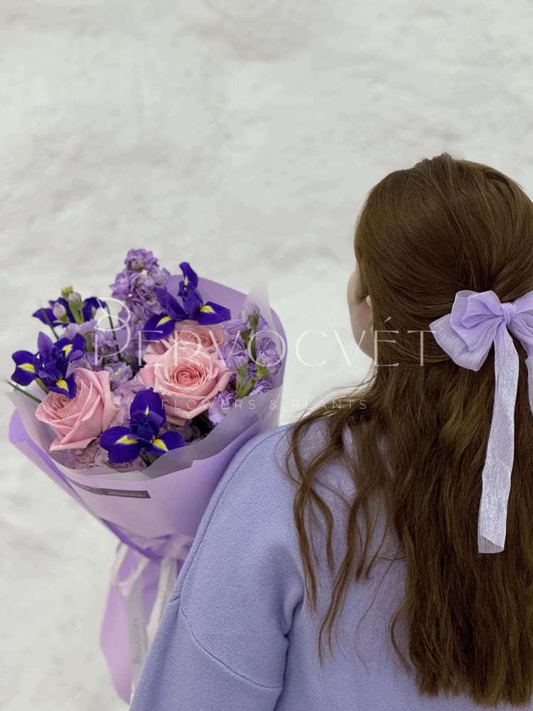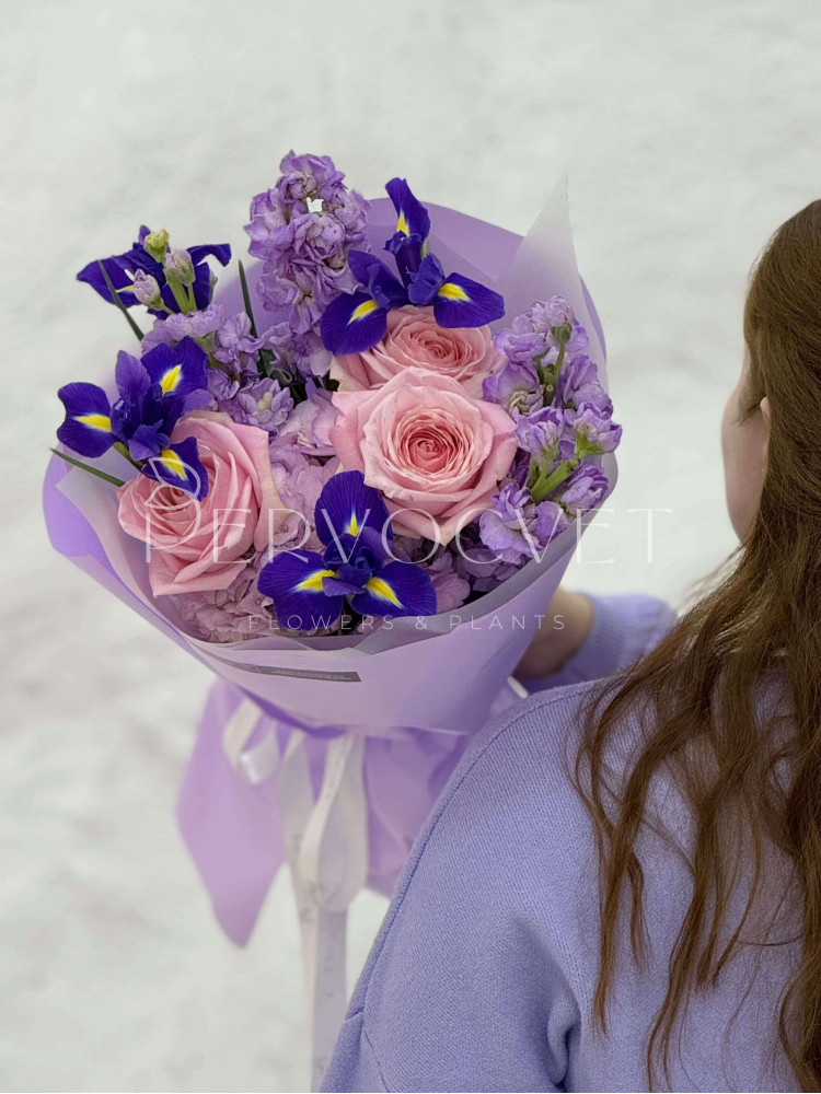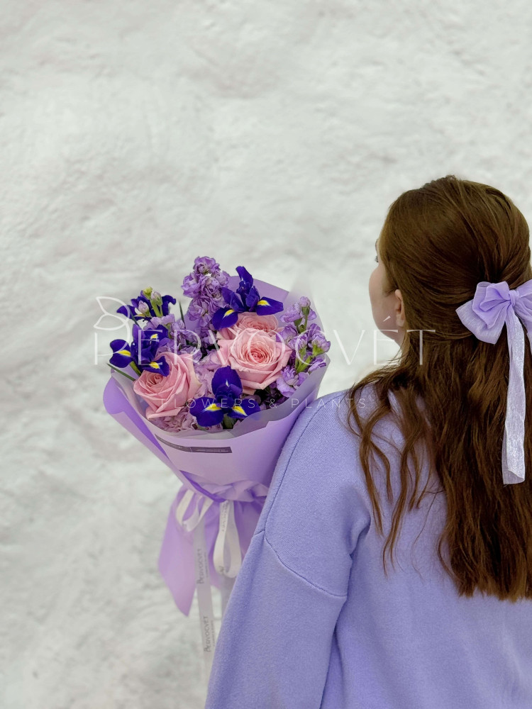 Букет в сиреневых оттенках, с самой ароматной розой Пинк Охара, синим акцентным ирисом и маттиолой - нежнейшее сочетание, в любимом оттенке людей творческих профессий, по нашему наблюдению. Если Ваш получатель человек творческий - выбирайте это сочетание !
