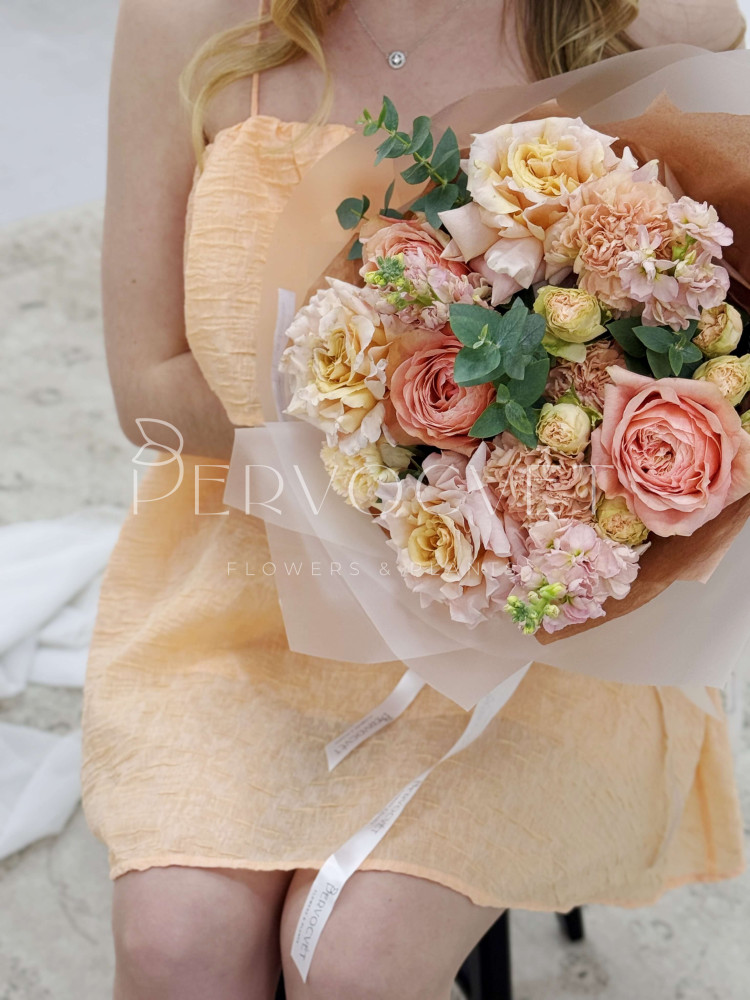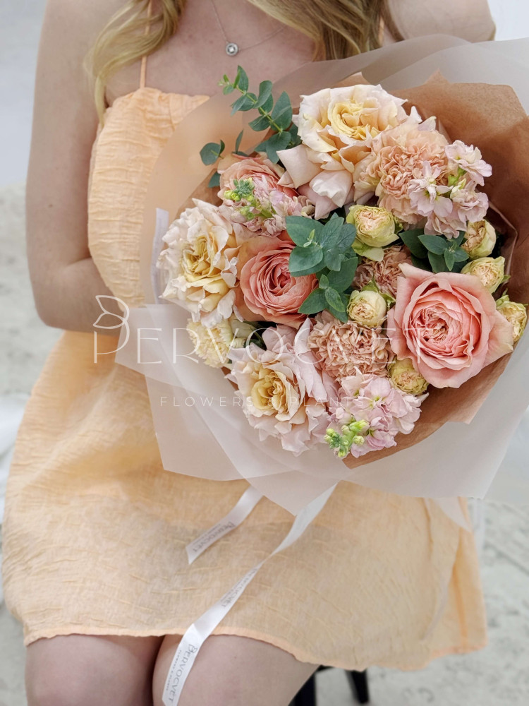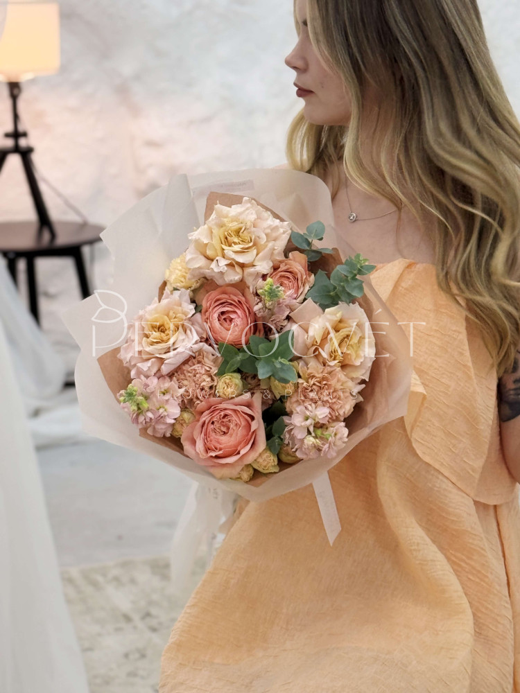 состав: французская роза, пионовидная роза, кустовая пионовидная роза, маттиола, гвоздика, эвкалипт