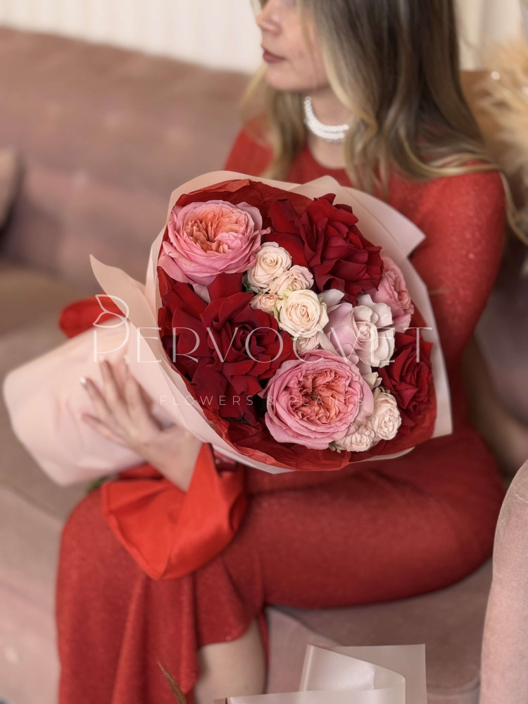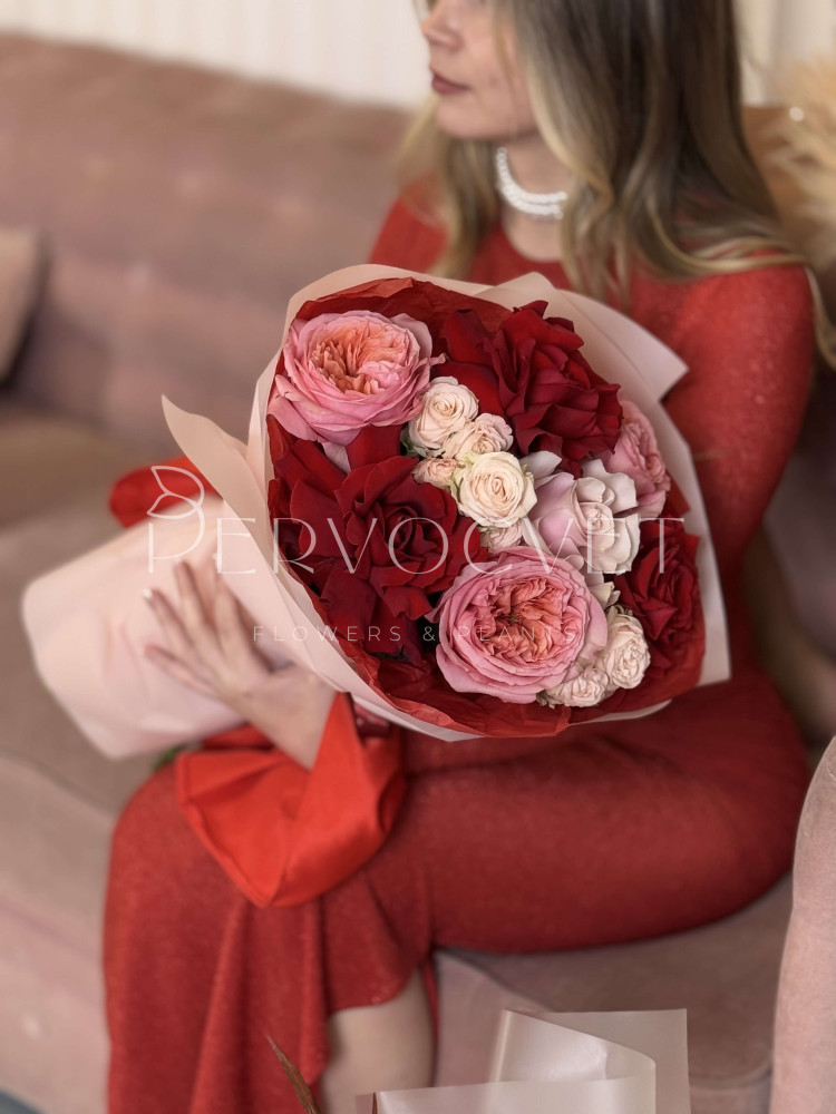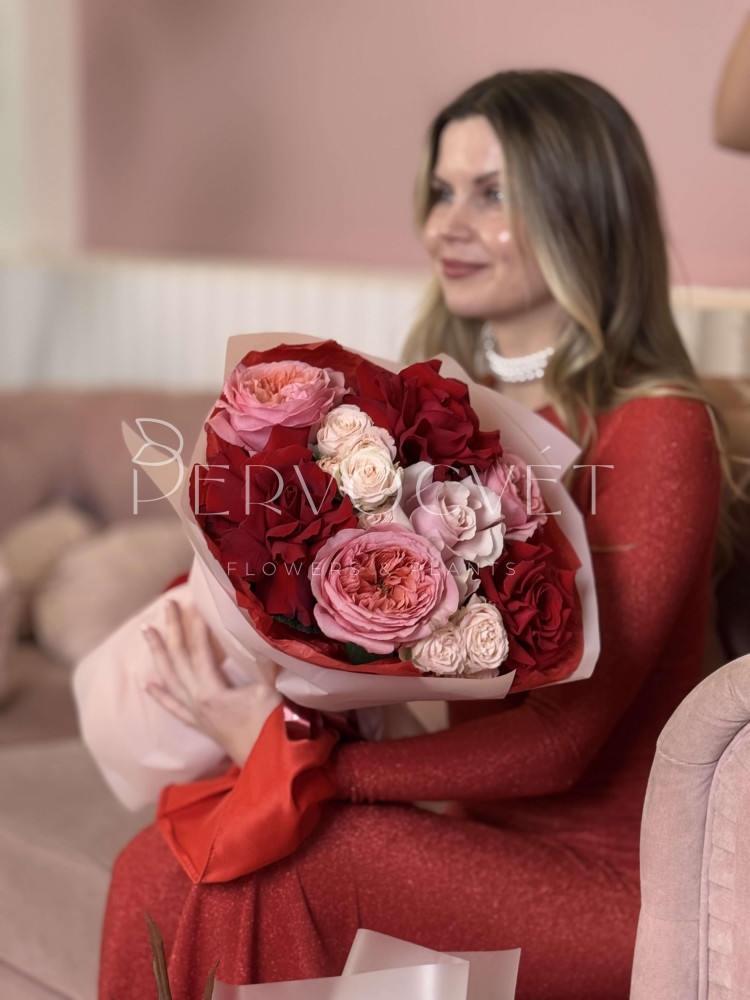 Букет роз, но не простых! Пионовидная роза сорта Экспрешн, с множеством оттенков бутона, два сорта французской розы в красном и розовом оттенке и кустовая роза , которая соединяет всю композицию вместе. Яркий и одновременно нежный букет из роз редких сортов!