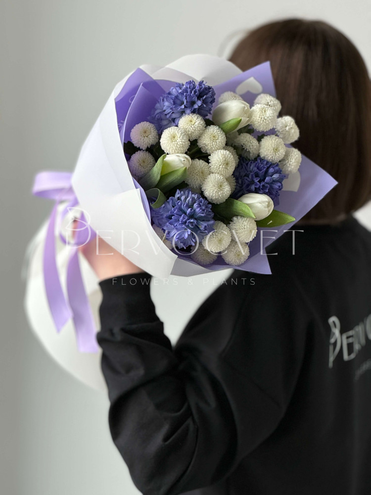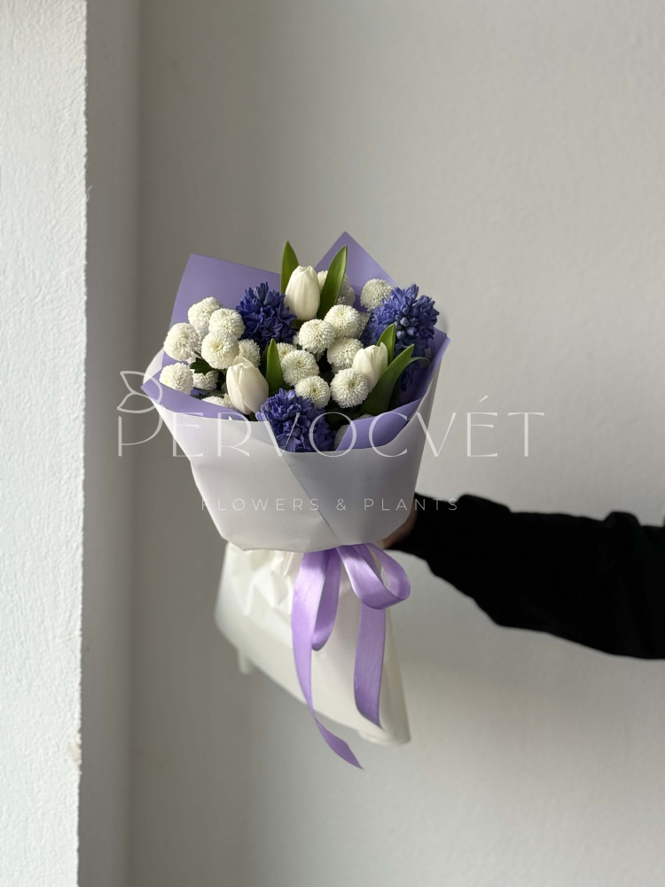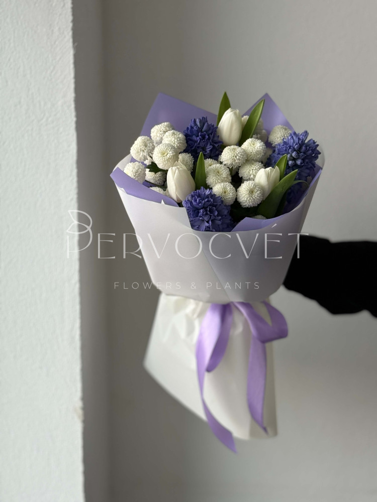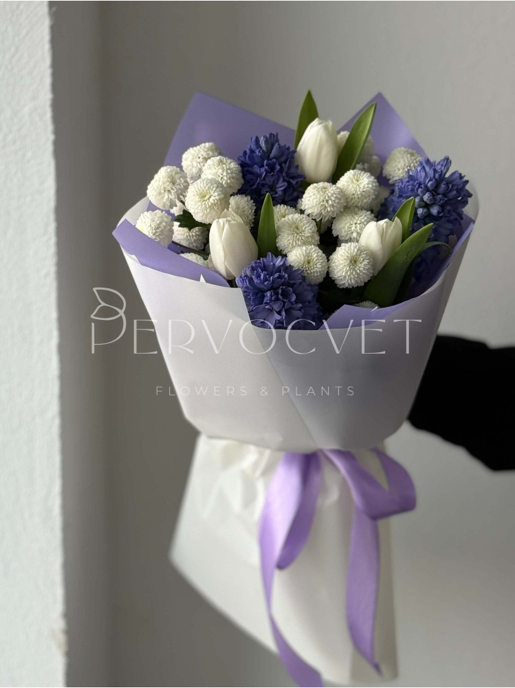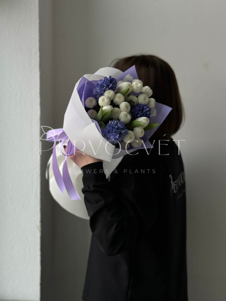 Ароматный и утонченный: редкий оттенок сине-фиолетового и очень ароматного гиацинта, белые тюльпаны и хризантема сорта Ньютона. Пышный букет весенних первоцветов - это любовь !