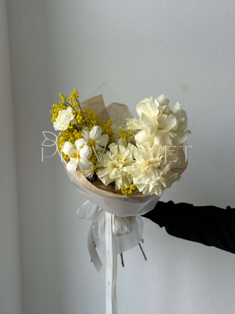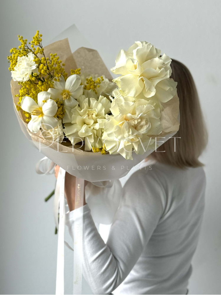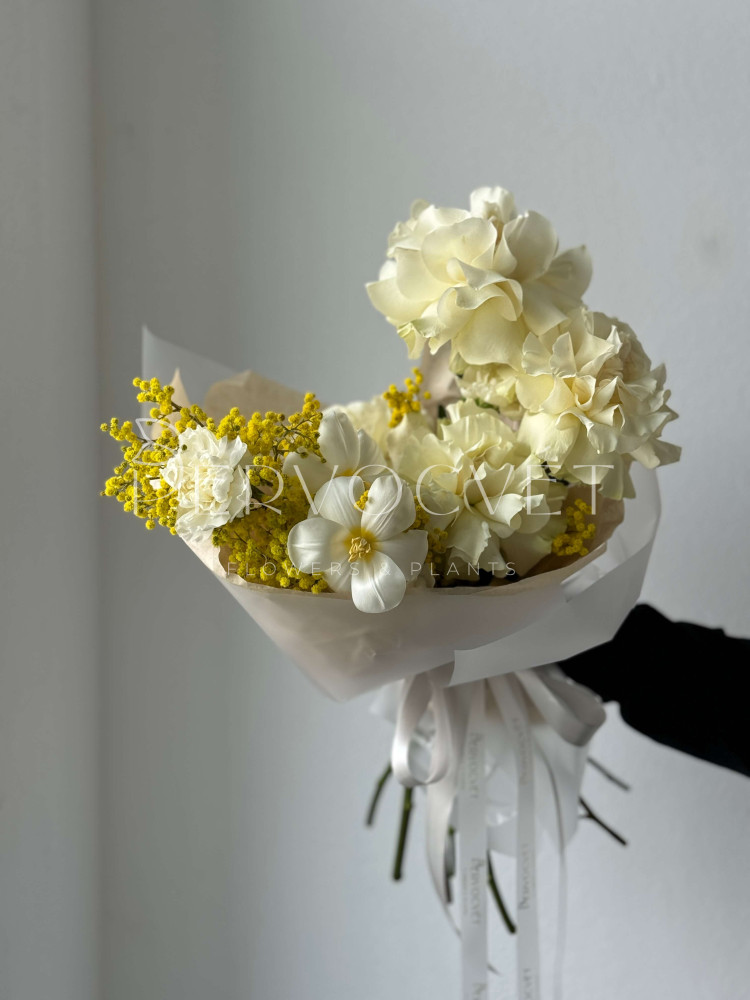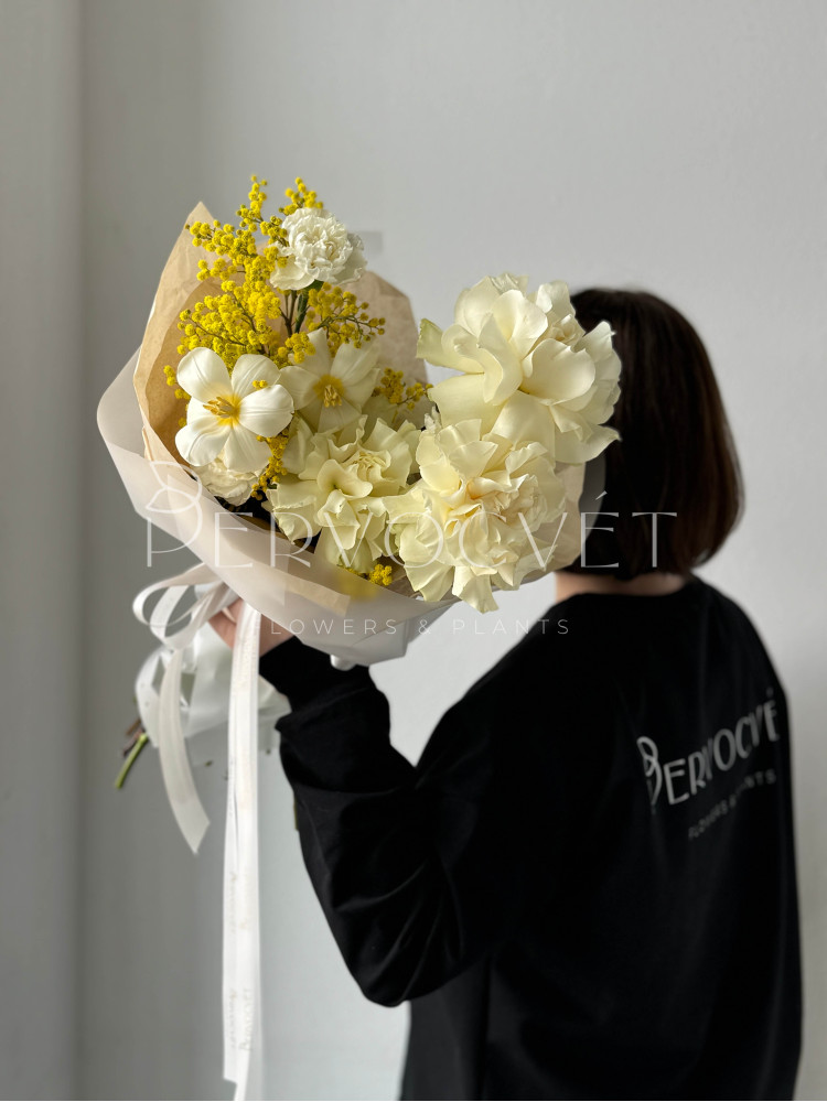 Самый нежный и трогательный букет каталога, с ароматными "солнышками" мимозы. Французская белая роза придает букеты воздух и утонченность, а вывернутый по специальной технологии тюльпан - настоящий акцент ! Невероятная весенняя красота . .