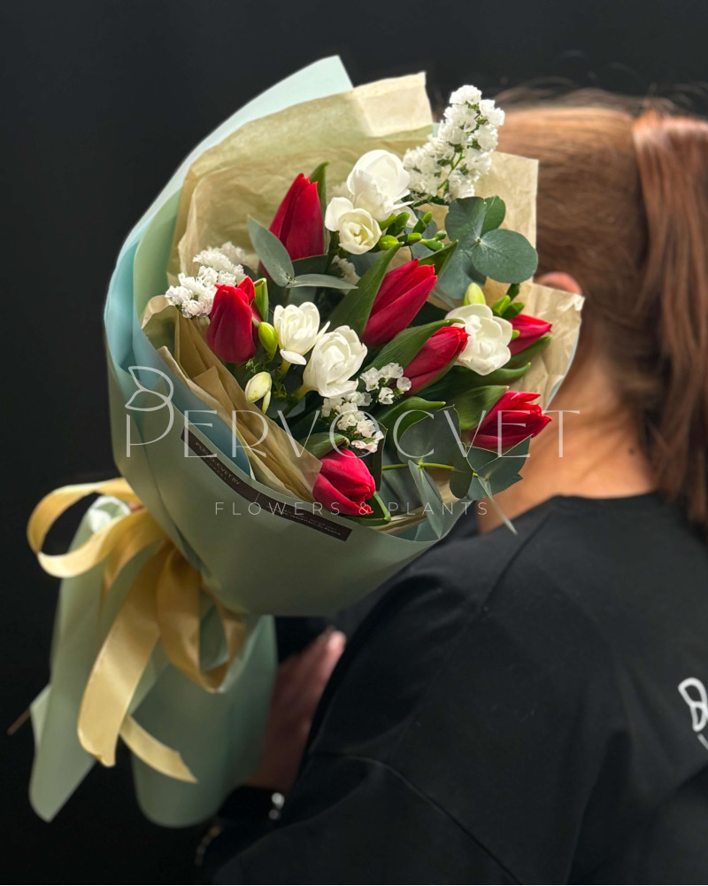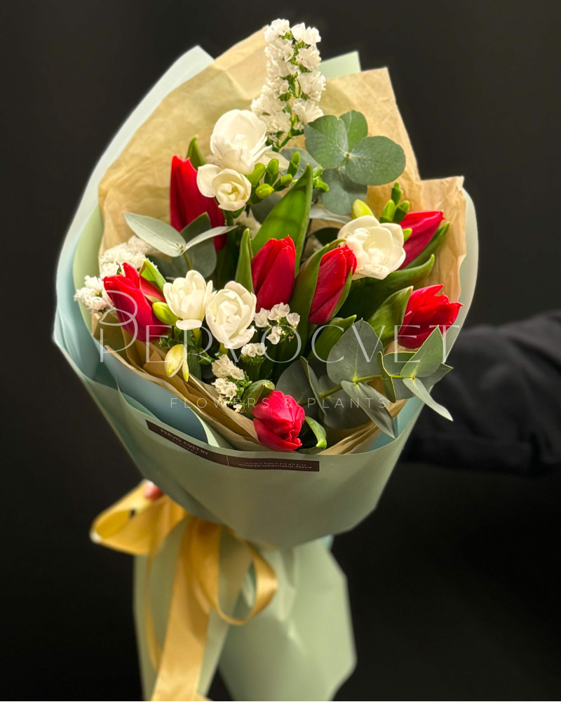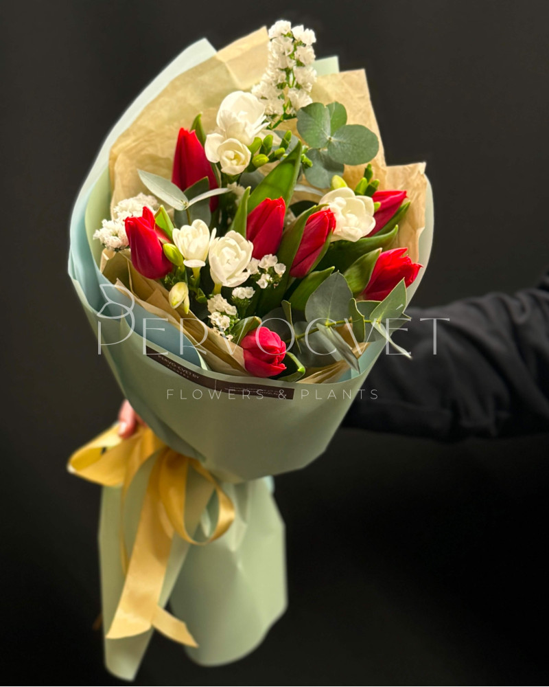 Алый тюльпан и ароматная фрезия, а с веточками статицы букет становится абсолютно трогательным и полным заботы и любви - весенние, ароматные цветы в красивом сочетании !