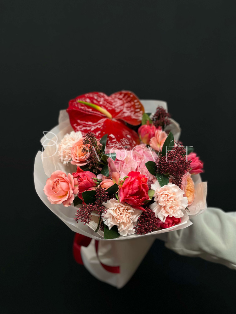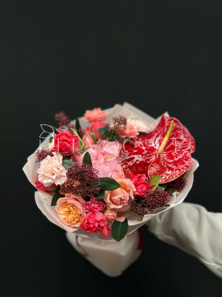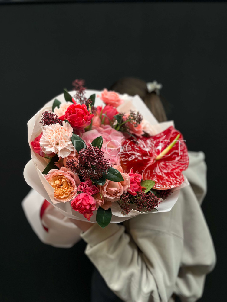 Разные фактуры в сочных оттенках с пионовидными алыми тюльпанами и акцентным антуриумом. Букет, который хочется рассматривать: собран сферой, но удивительно разнородной и идеально сочетаемой фактурой и оттенками. Это и весна, и осень, и лето, и зима - невероятно красивый букет для самого близкого и любимого человека, которого надо восхитить в этот день !