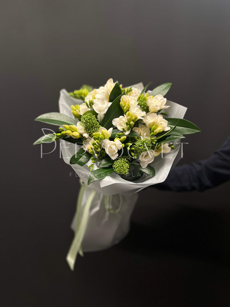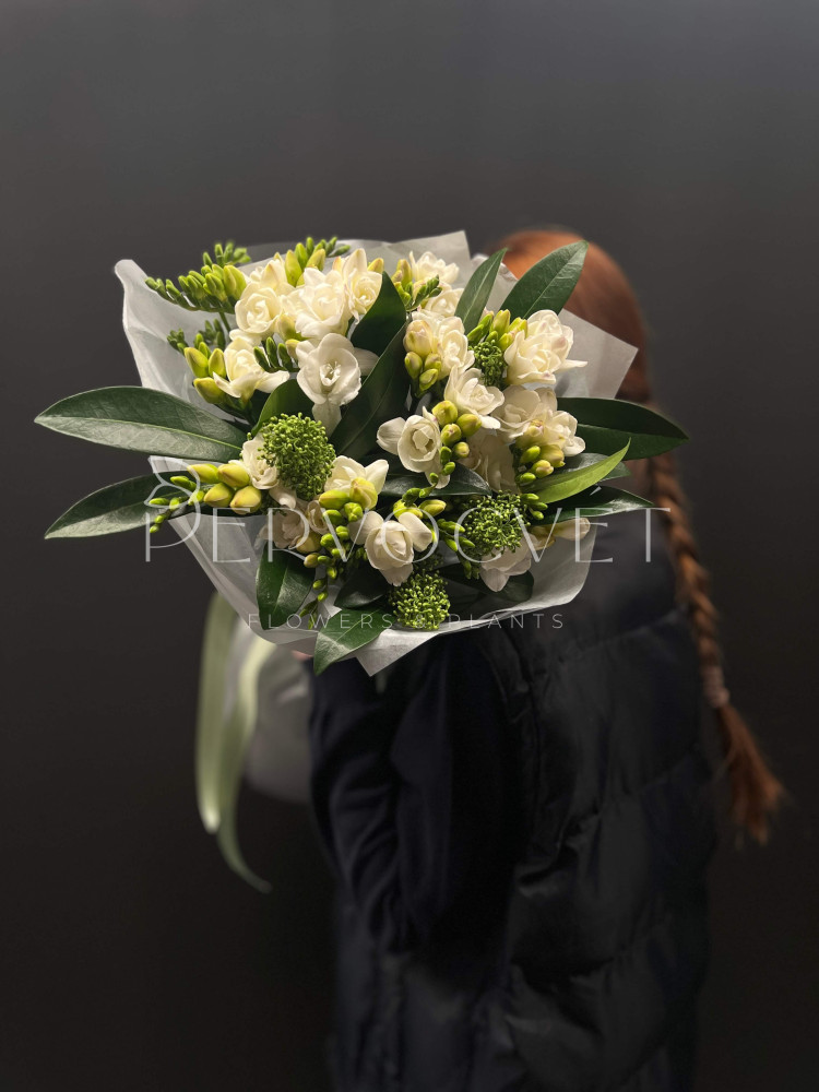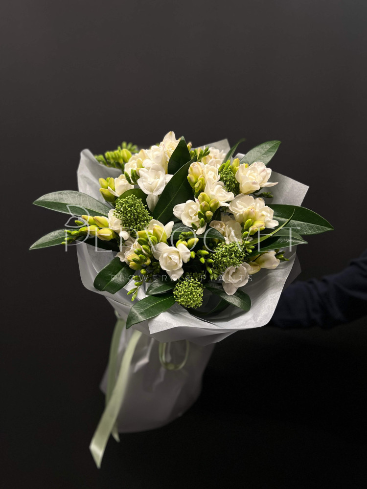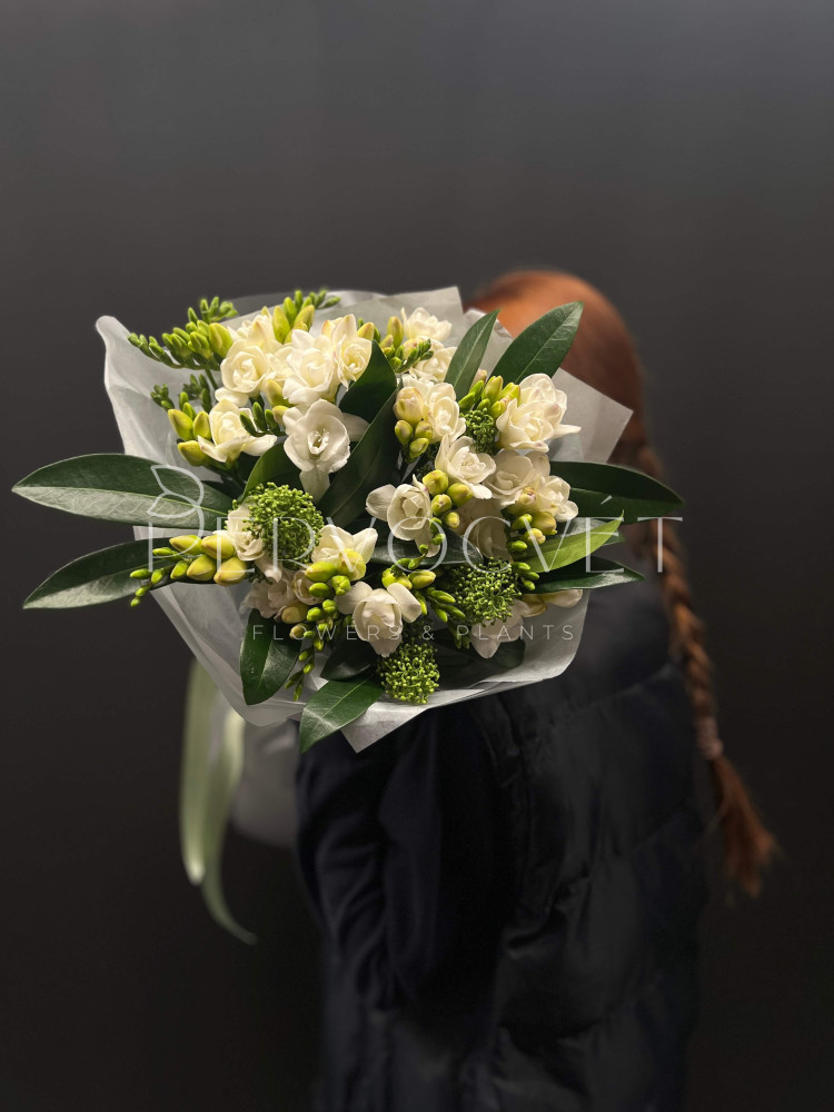 Ароматные белые фрезии, которые сводят с ума ароматом и утонченностью цветка - стойкий букет нежнейших цветов, которые будут раскрываться каждый день, бутон за бутоном! А зелень с соцветиями зеленой скиммии - уникальная и редкая, идеальное дополнение, чтобы подчеркнуть каждый цветочек.