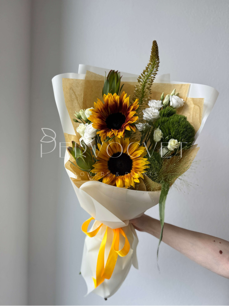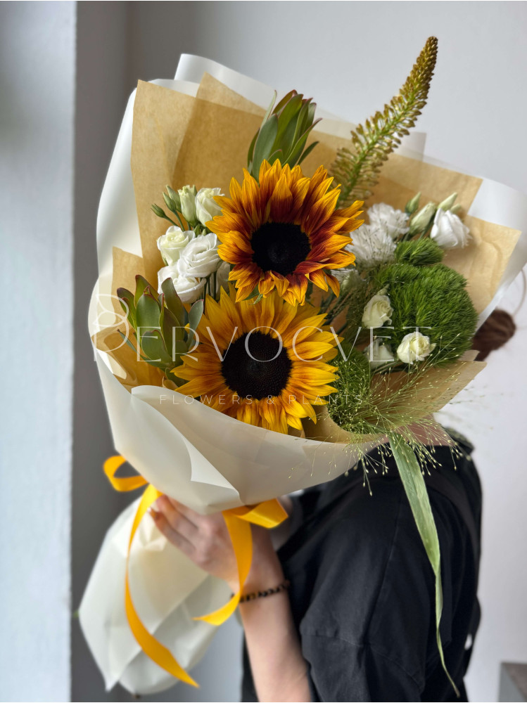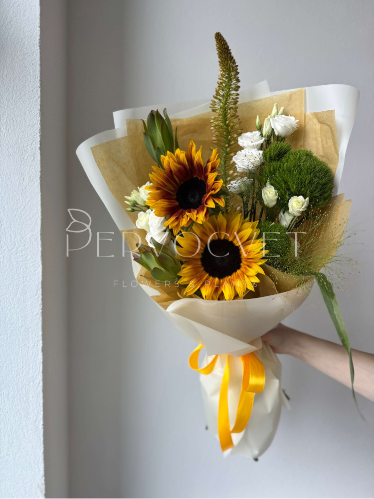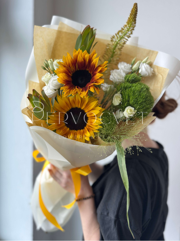 состав: подсолнух, гвоздика Грин Трик, эустома, леукодендрон, эремурус, паникум, фисташка (тех.зелень)