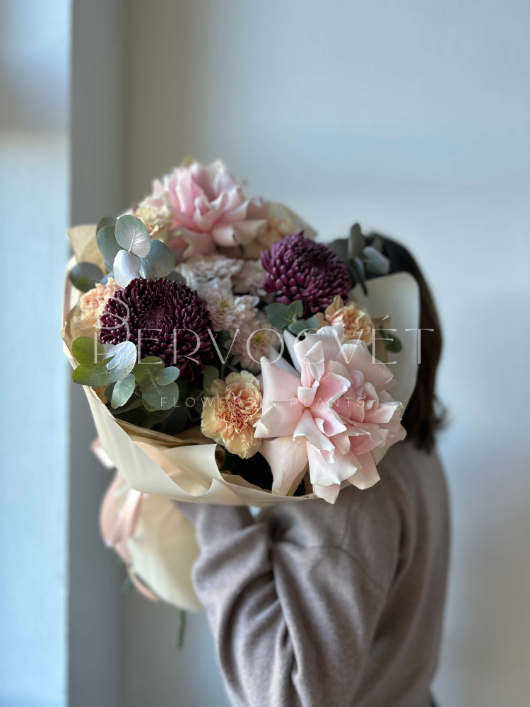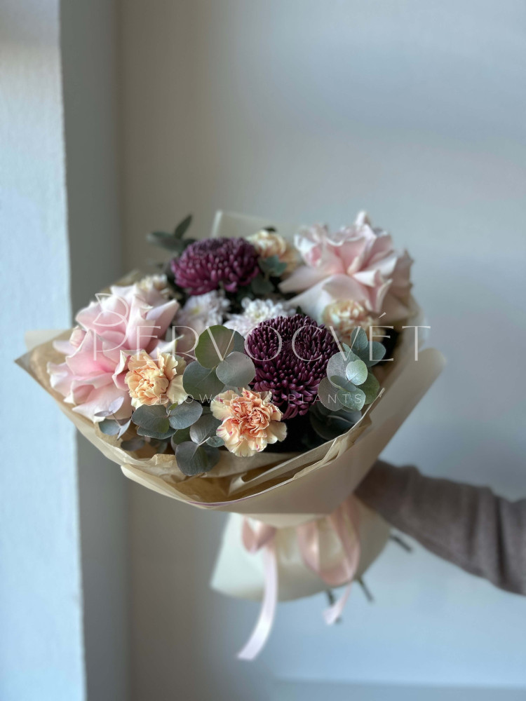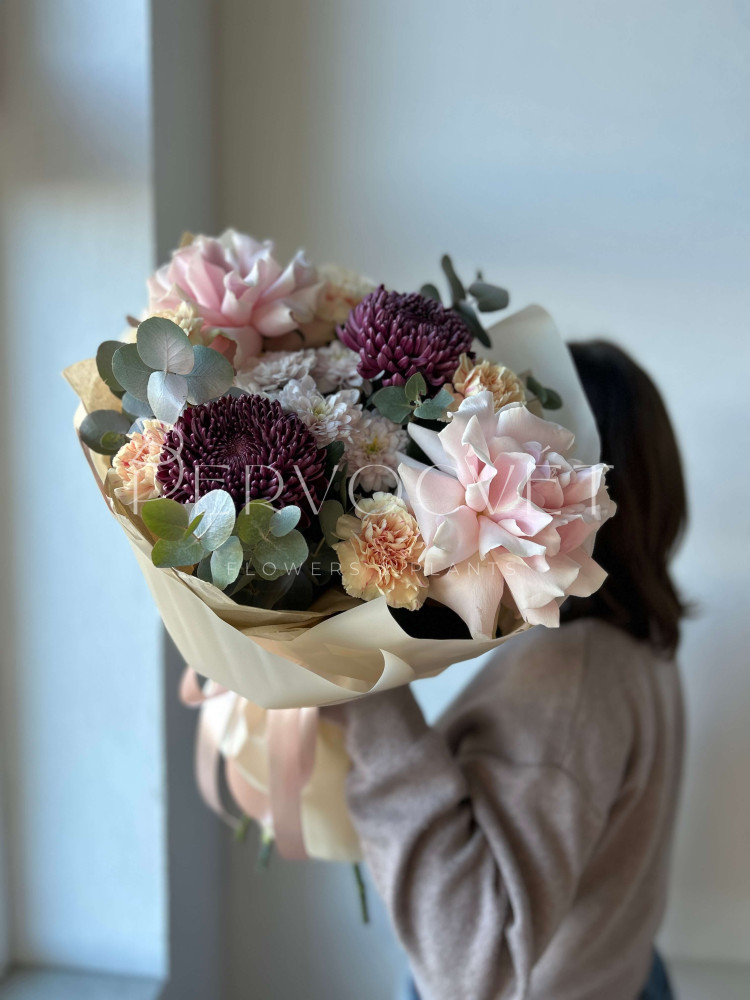 Новинка сентября 2025 - букет в нежных оттенках осеннего солнца. Розовая французская роза, насыщенные хризантемы сорта Бигуди, персиковый диантус и зелень эвкалипта. Сочетание, которые идеально в подарок маме, жене или подруге !