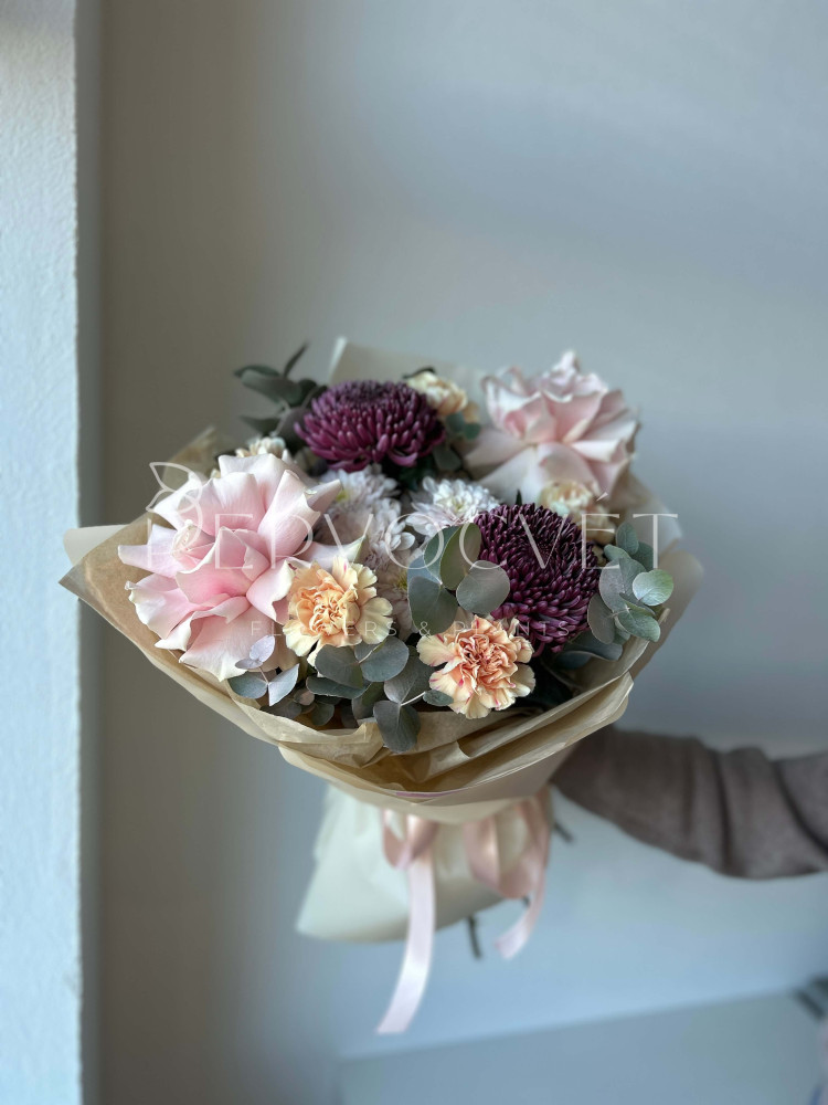 состав: хризантема Бигуди, французская роза, хризантема, гвоздика, эвкалипт
