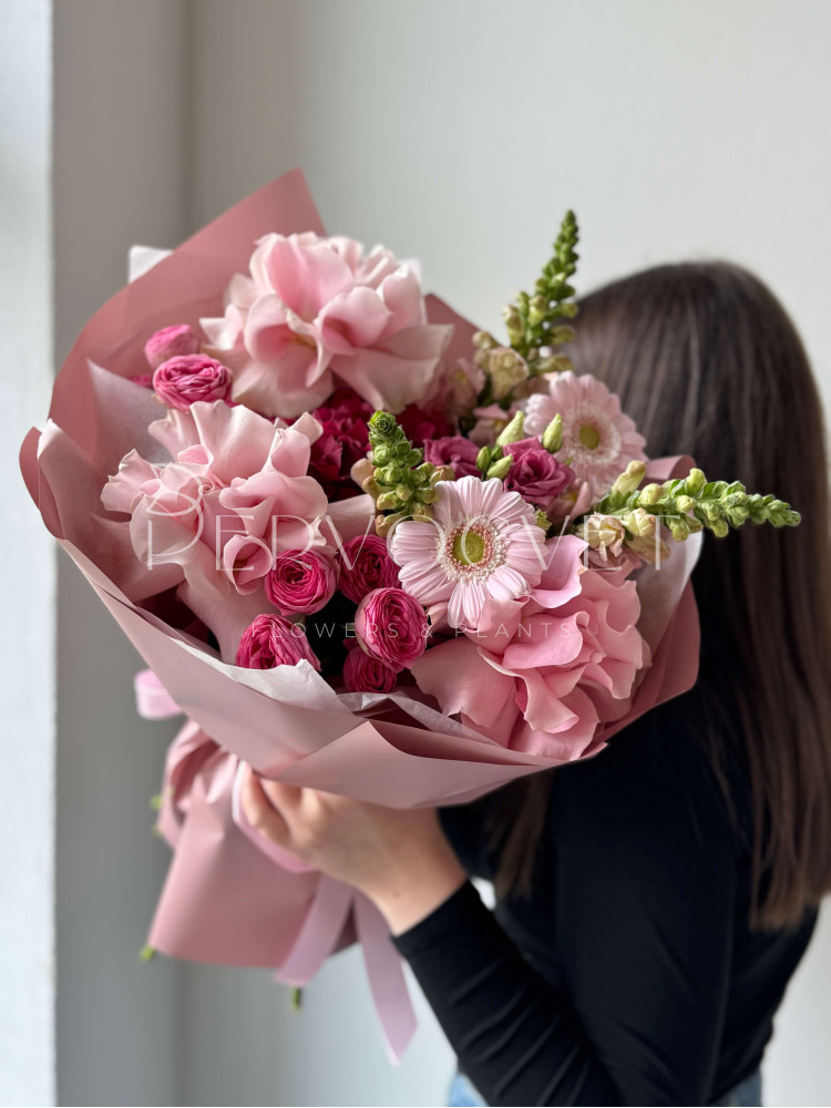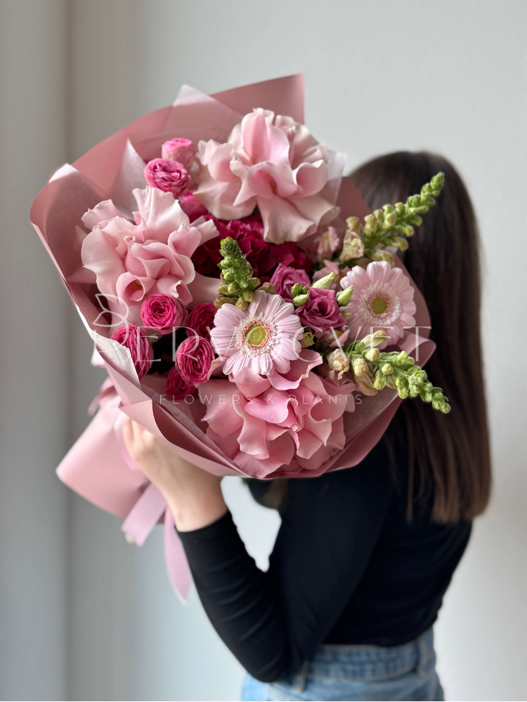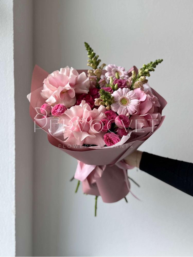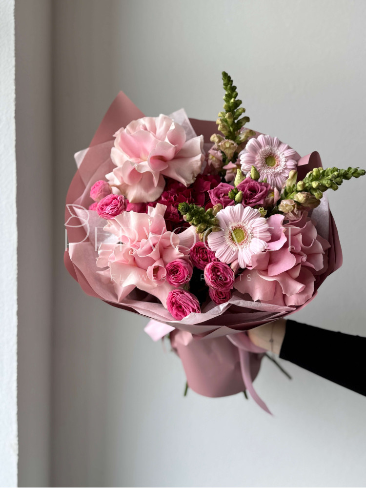 Розовое безумие с акцентными ромашками гербер. Настоящий взрыв малины в ярких оттенках с французской и пионовидной розой, с акцентным антирринумом ! Идеальный, пышный и фактурный.