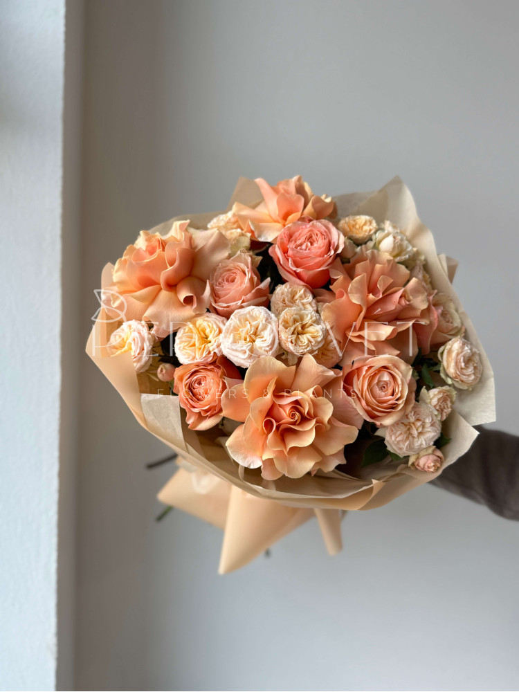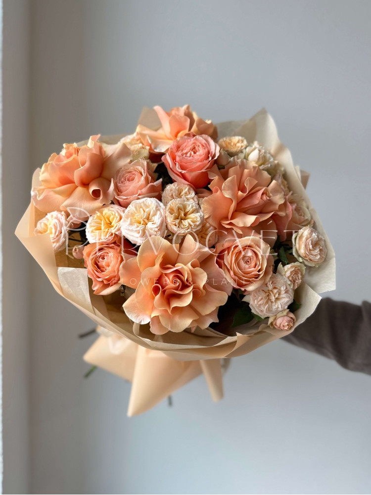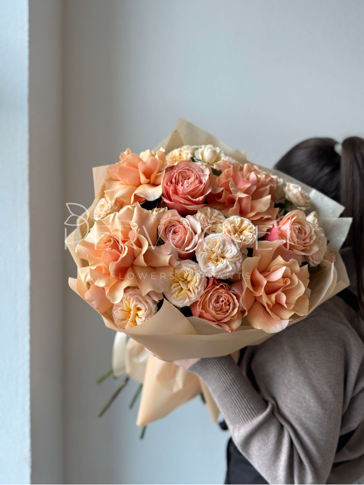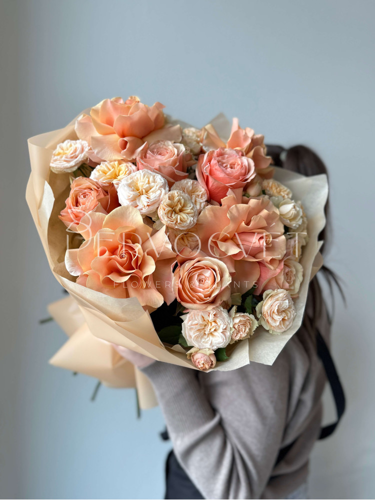 Букет из трех сортов роз: персиковая французская, пионовидная роза Кахала и кустовая пионовидная роза сорта Трендсеттер! Фактуры, бутоны, розы - беспроигрышный вариант для любого повода.