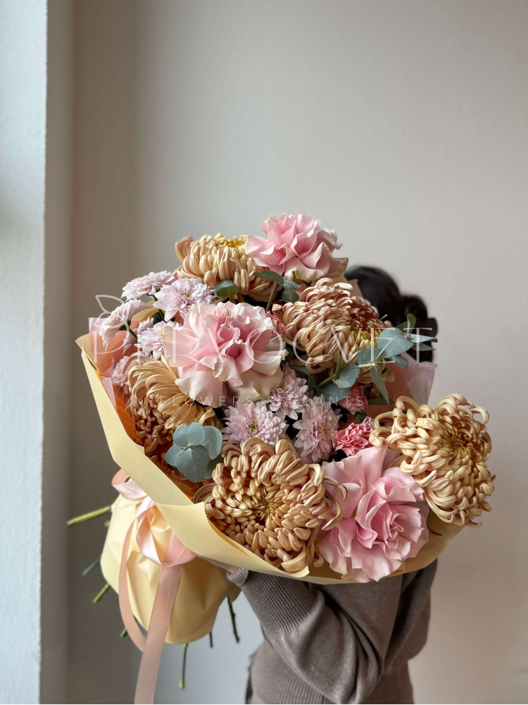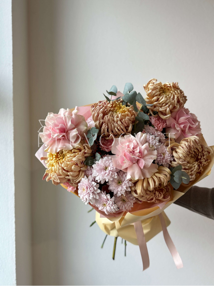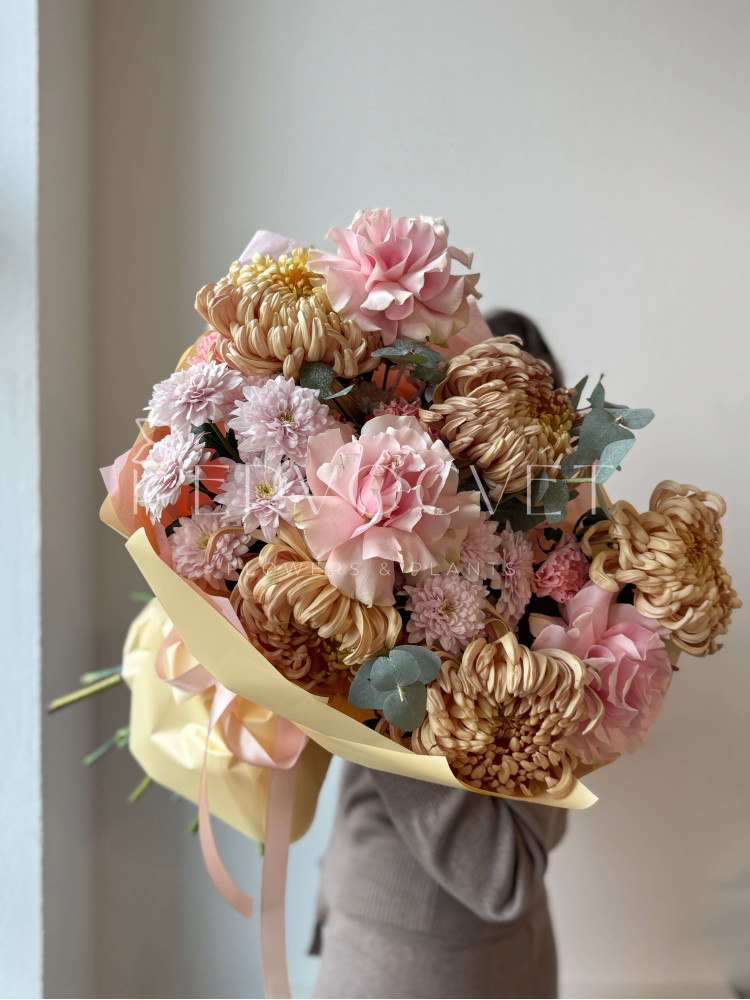 Осень пахнет хризантемами! Уникальный сорта Виенна, кустовая пушистая хризантема, французские роза и эвкалипт - фактуры, оттенки и аромат. Большой букет осени!