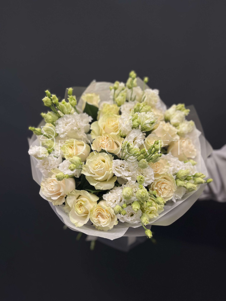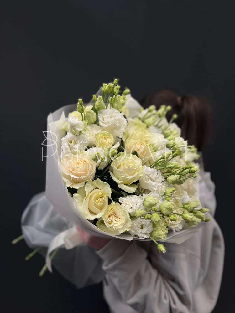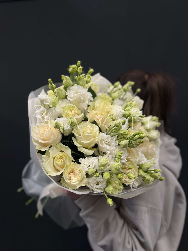 Классика в оттенках благородного белого: ароматная эквадорская роза сорта Мондиаль и белая эустома. Очень пышно, очень красиво и подойдет как для любимой, близкого человека, мамочки или даже делового партнера !