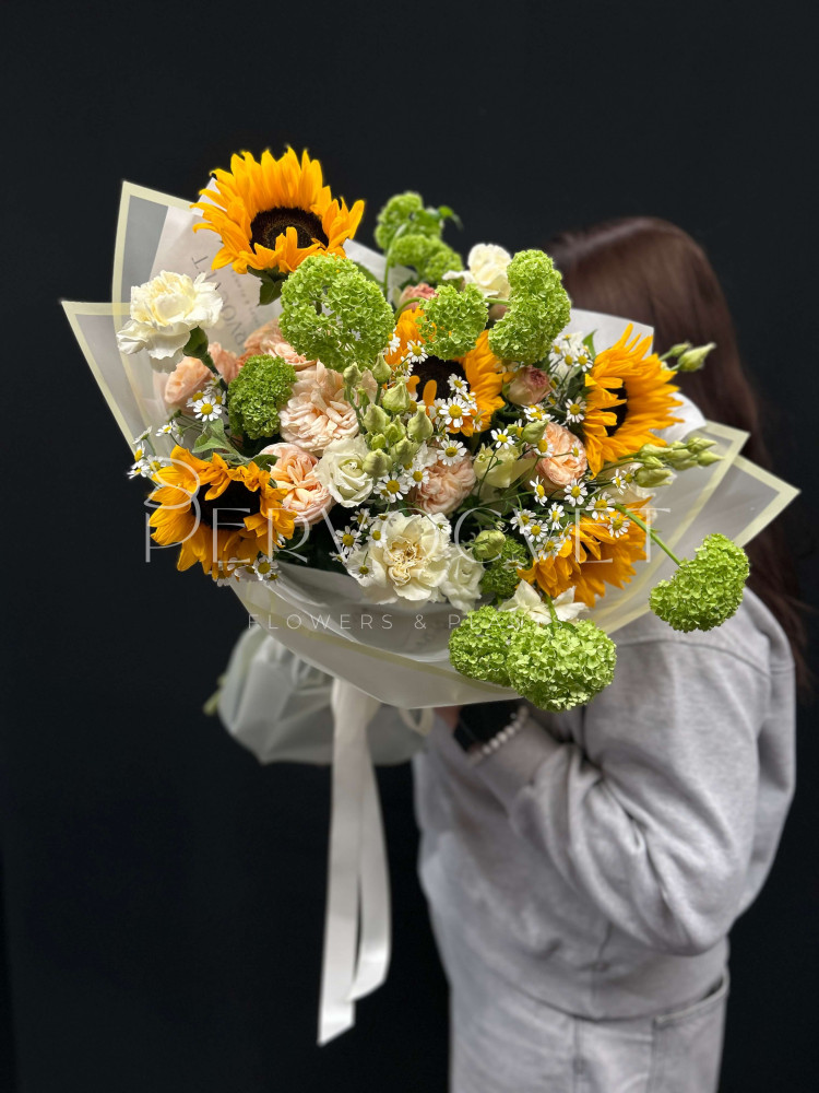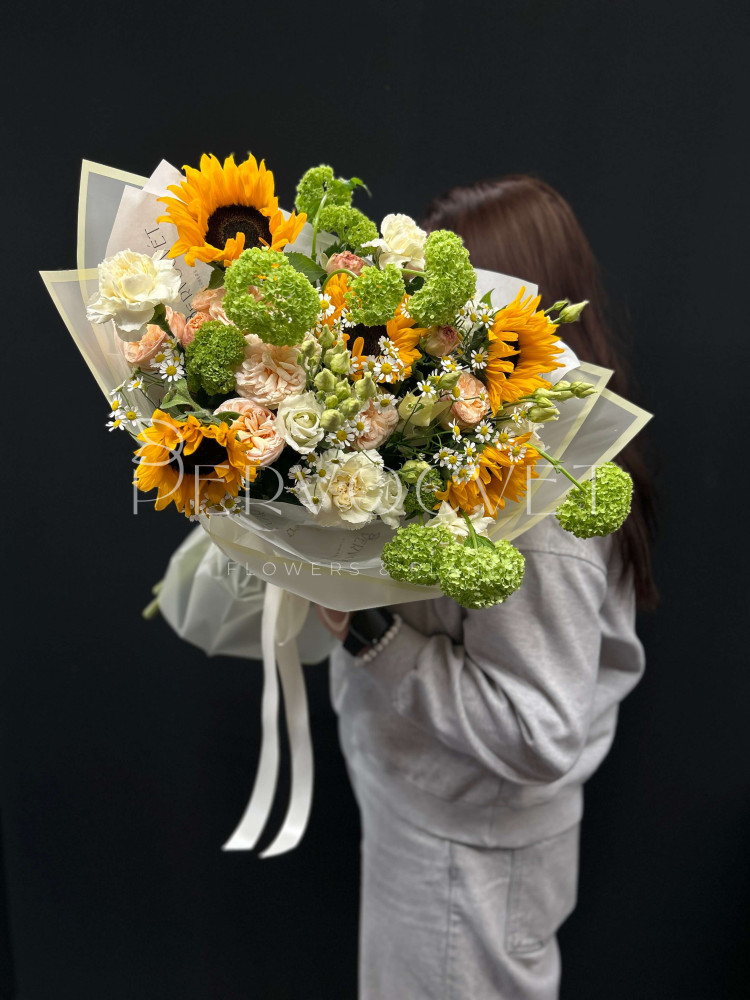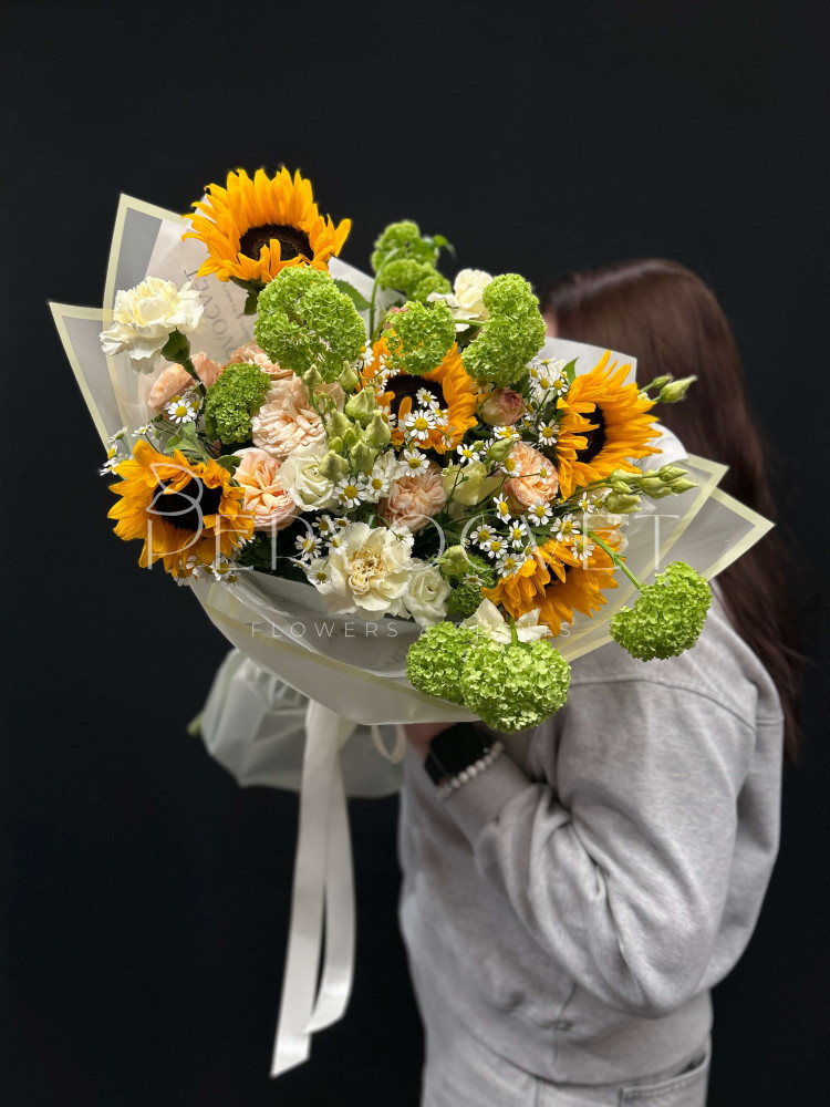 Весна и лето в букете - подсолнух и ромашка Танацетума в оригинальном составе с зеленым вибурнумом и пионовидной розой. Настроение на каждый день, стойкие цветы в ярких оттенках, которых всегда не хватает!