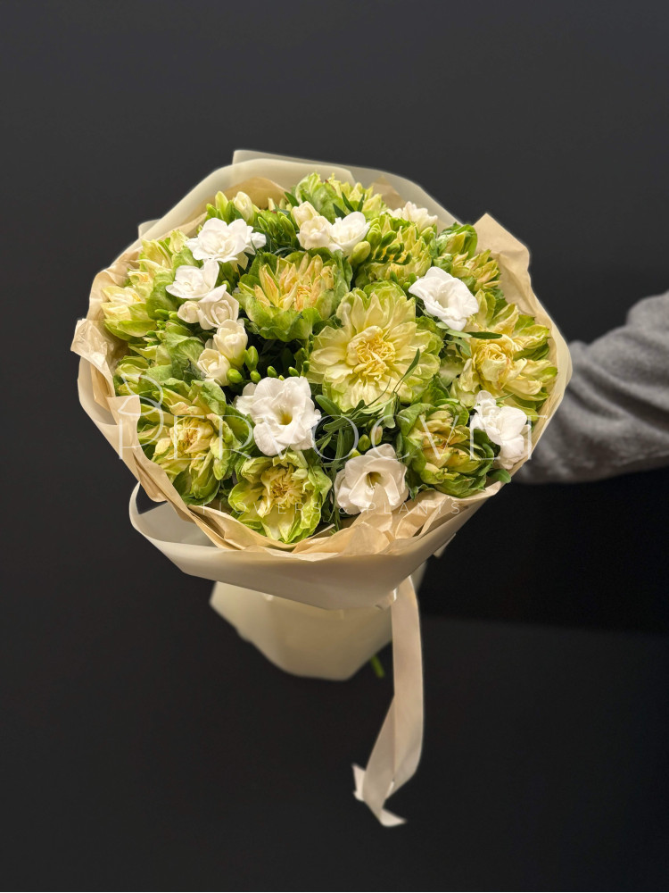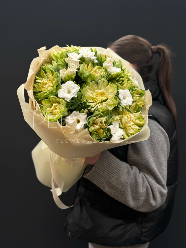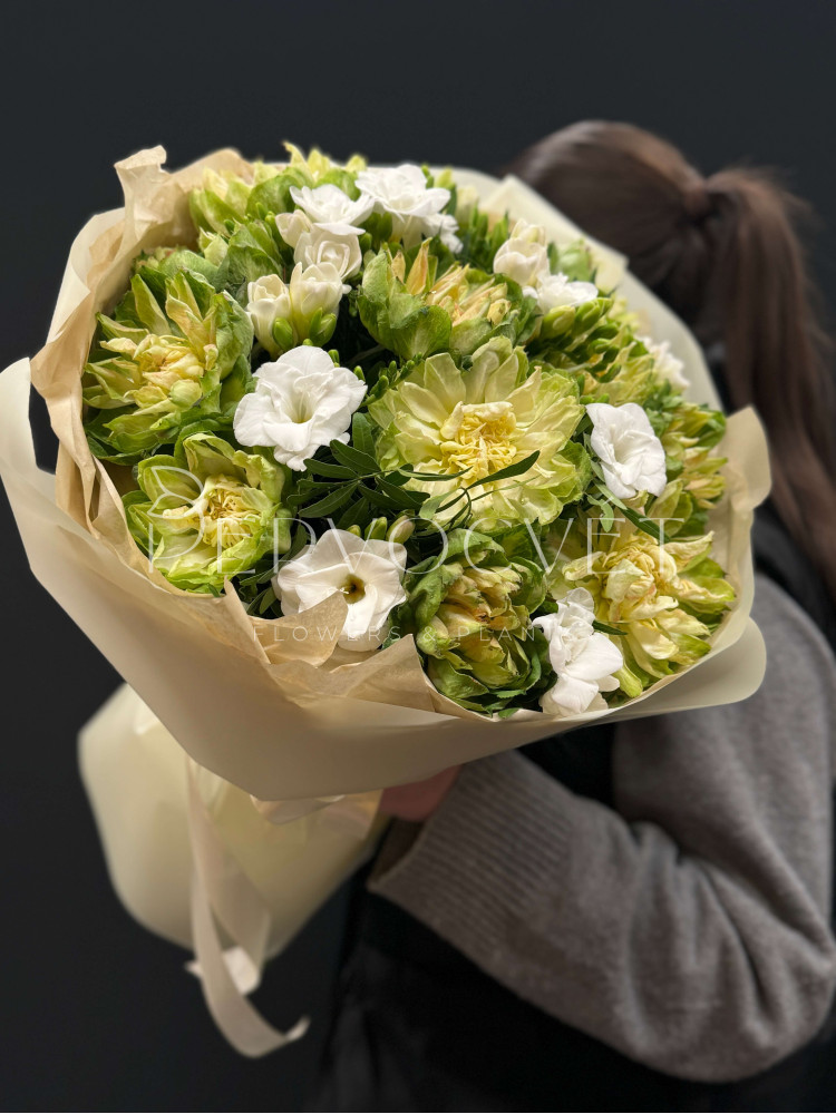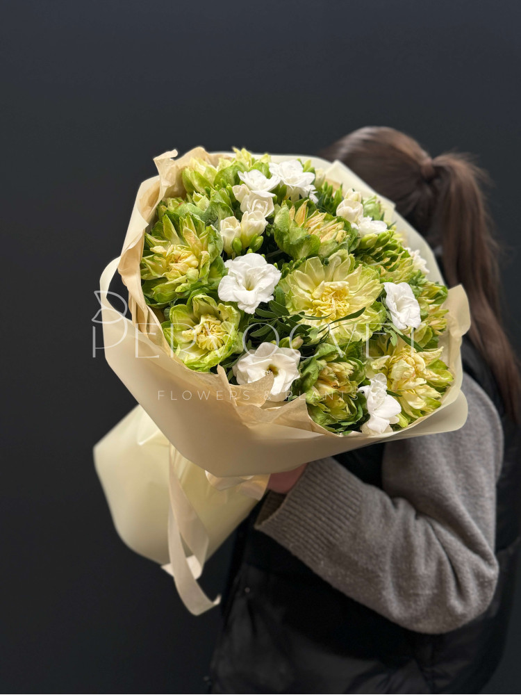 Роза-новинка сорта Вегги и ароматная фрезия - идеальное сочетание уникальности и аромата. Нежное сочетание бело-зеленых оттенков в пышной упаковке. Для девушек, которые предпочитают розы, но не классику, а редкий сорт!