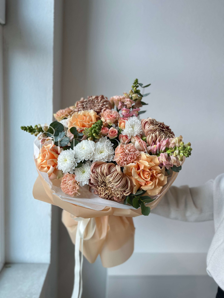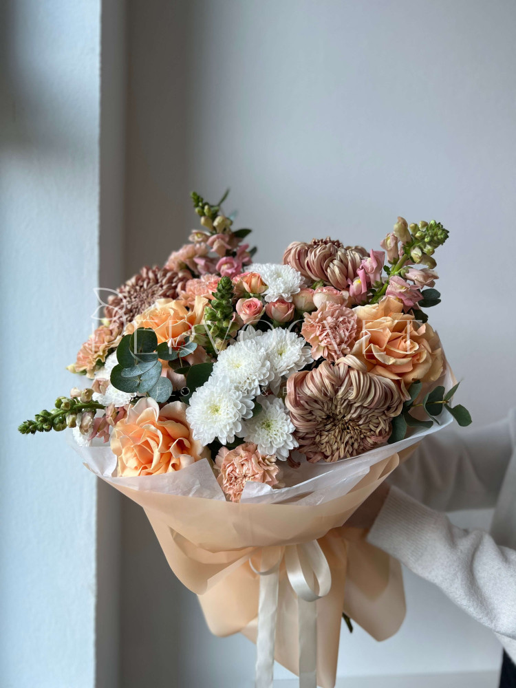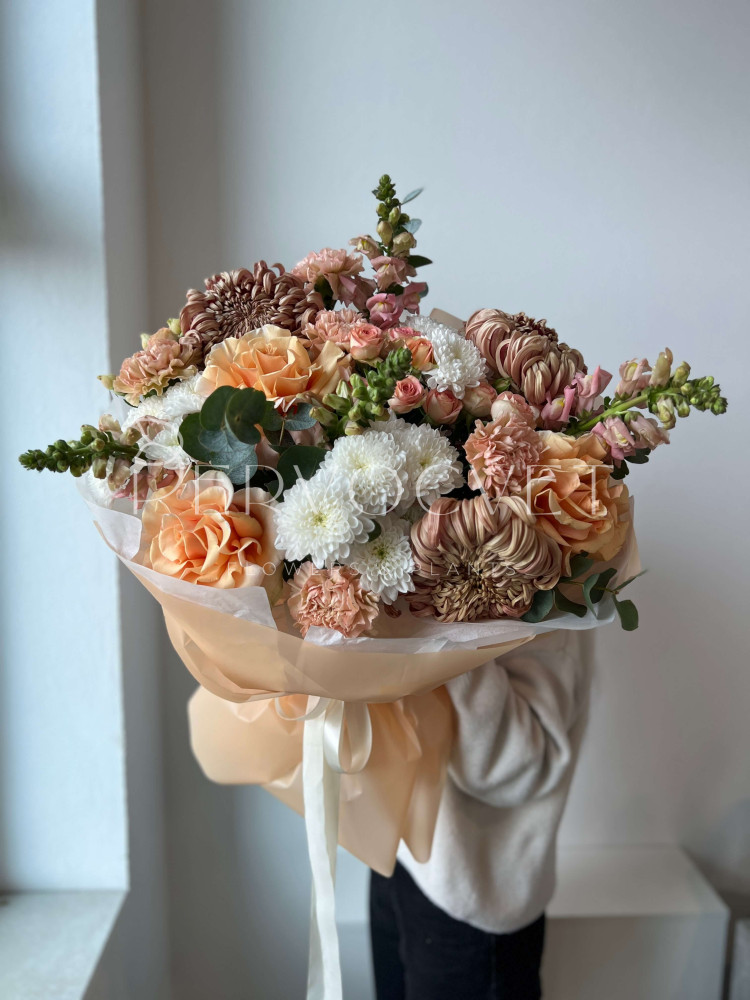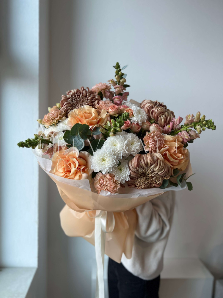 Фактуры осени и изысканные оттенки: розы, хризантемы и антирринум - стойкое пышное сочетание для важного повода! А подарить такое можно только в осенний сезон, что делает этот букет особенно уникальным подарком.