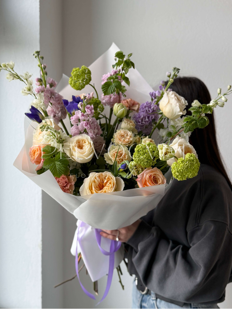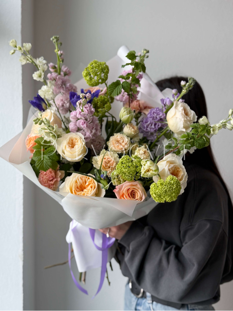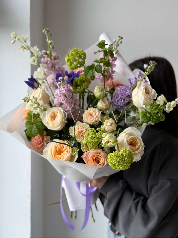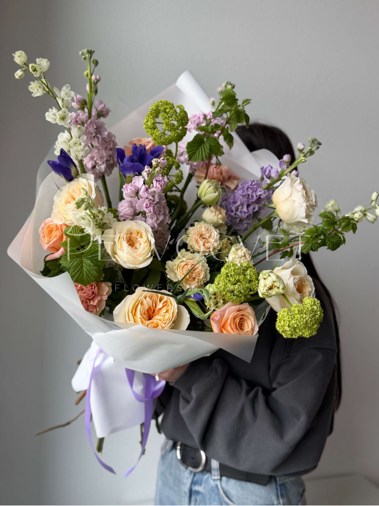состав: дельфиниум 3, роза Эквадор 3, пионовидная роза 5, ирис 4, тюльпан 3, кустовая пионовидная роза 1, гвоздика 2, маттиола 4, вибурнум зеленый 2, веточки малины, фисташка (тех. зелень)