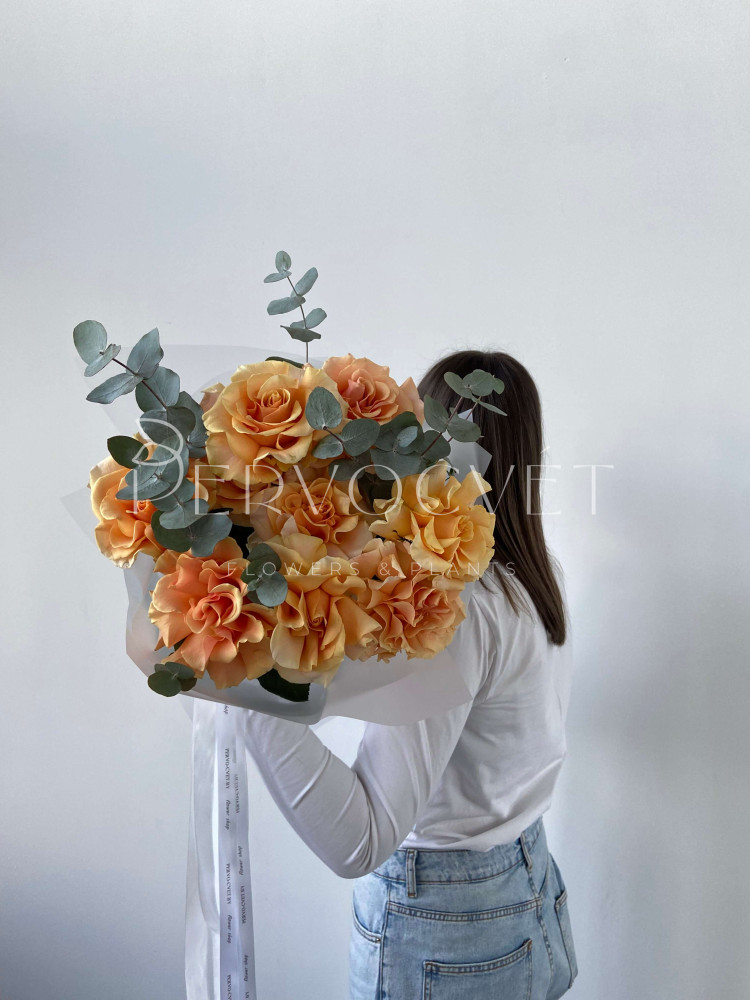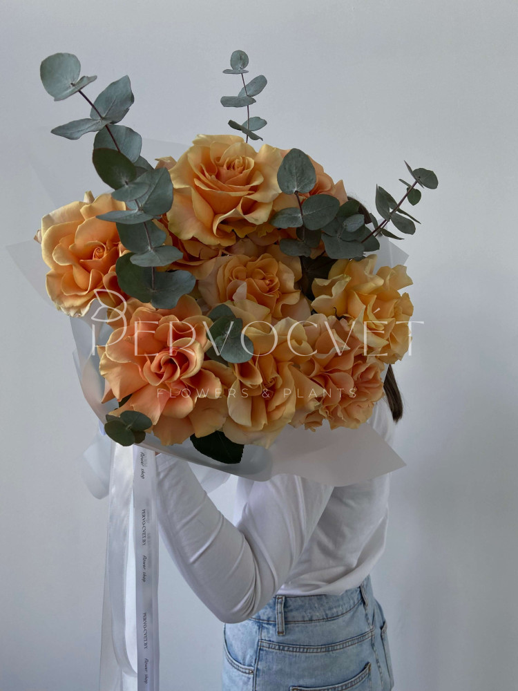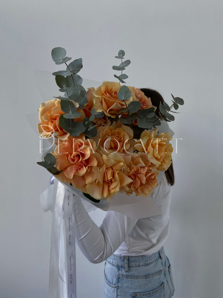 Нежные персиковые розы с эвкалиптом. Пышный букет необычных красивых роз в стильной упаковке.