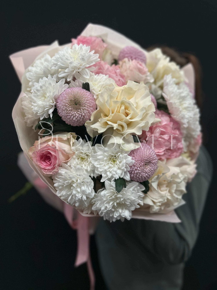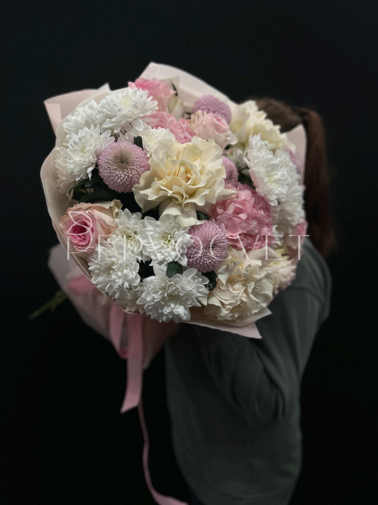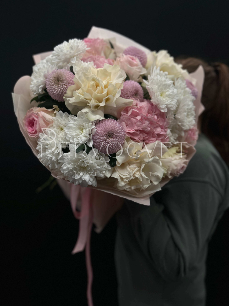 Разные фактуры и нежные оттенки - белый, розовый и сиреневый. Стойкая композиция, классической формы из французских белых роз, пушистых хризантем, эквадорских роз и колумбийской гортензии в розовом оттенке. Объемно, красиво и нежно в пышном оформлении!
