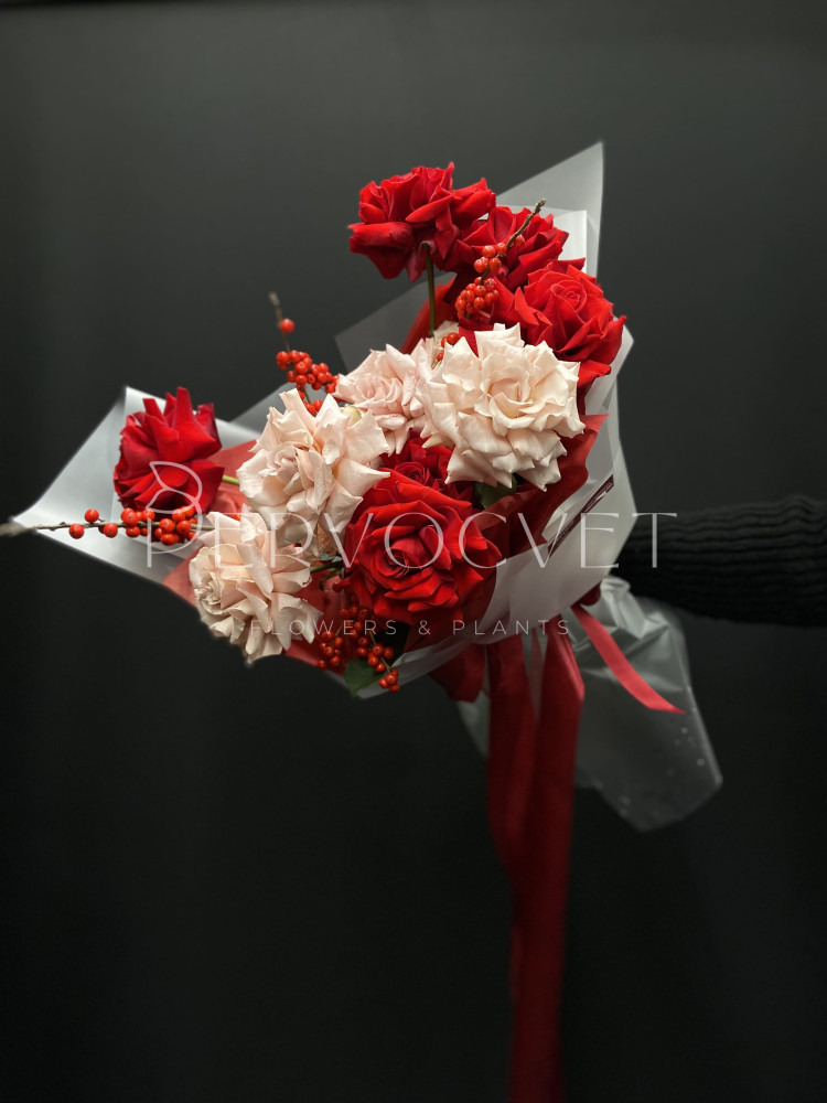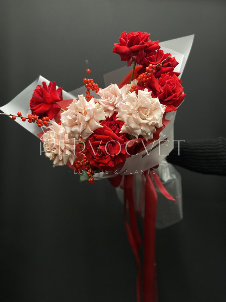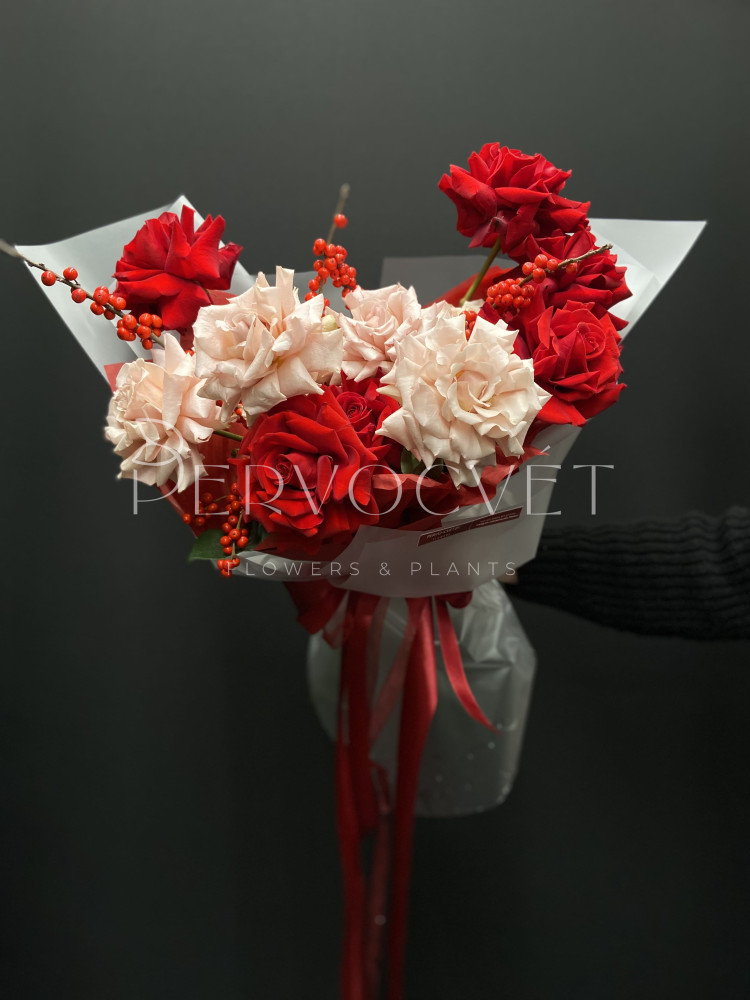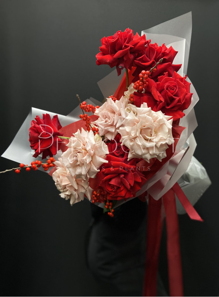 Одновременно яркий и нежный букет из французской розы и ягод красного илекса. Чтобы выразить чувства и подарить эмоции удивления!