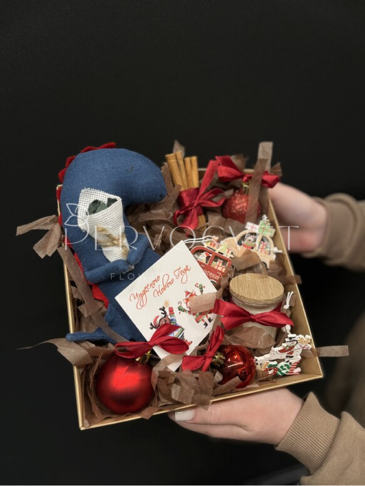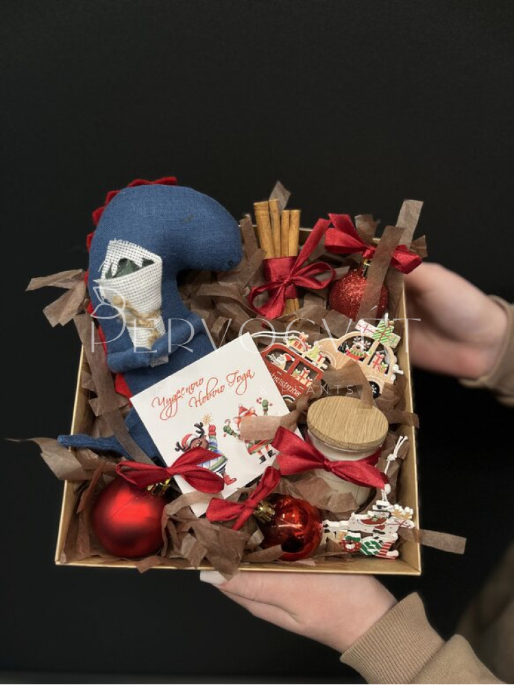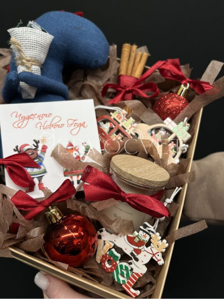 Новогодний бокс в подарочном оформлении с декором из новогодних шариков и фигурок, палочек корицы и льняной игрушкой. В набор также входит натуральная соевая свеча и карточка, для Ваших теплых поздравлений!