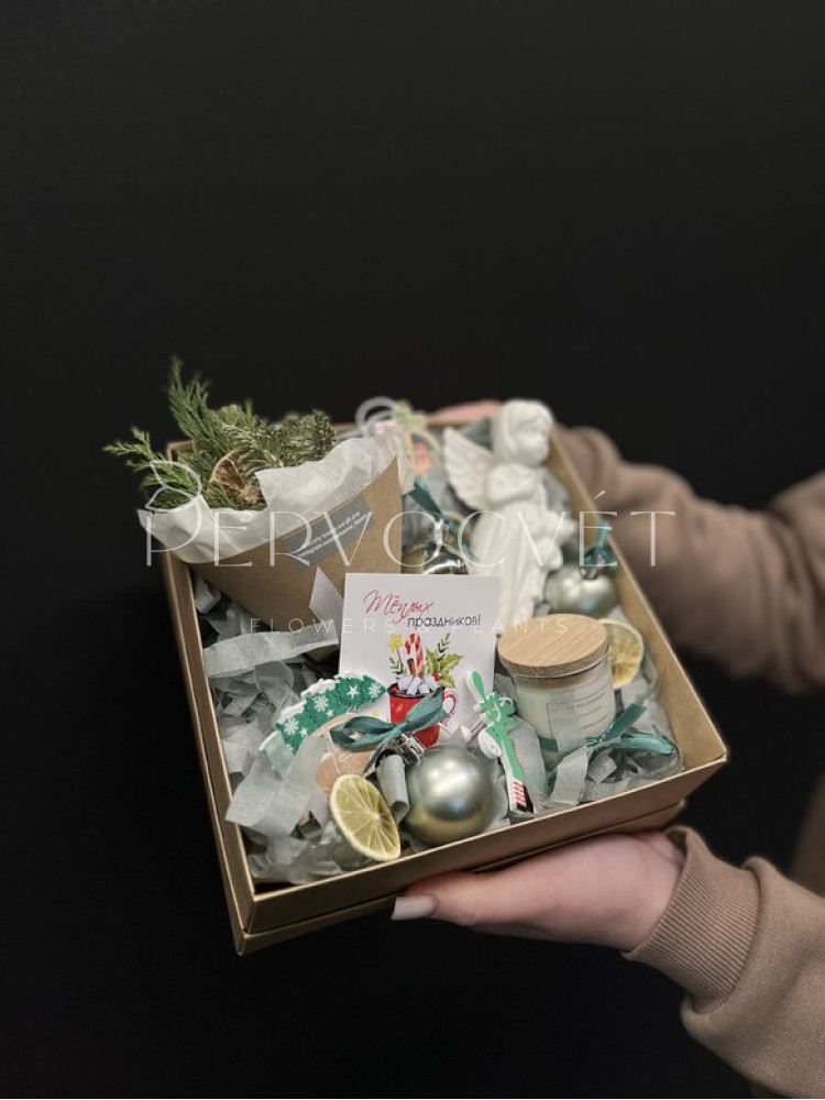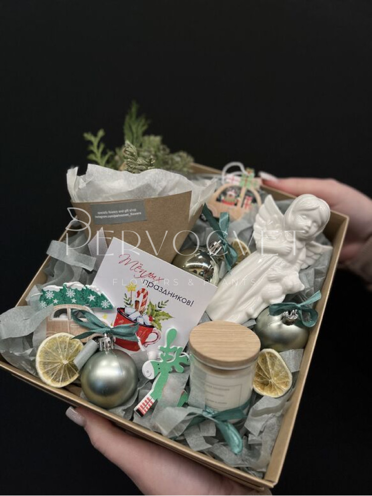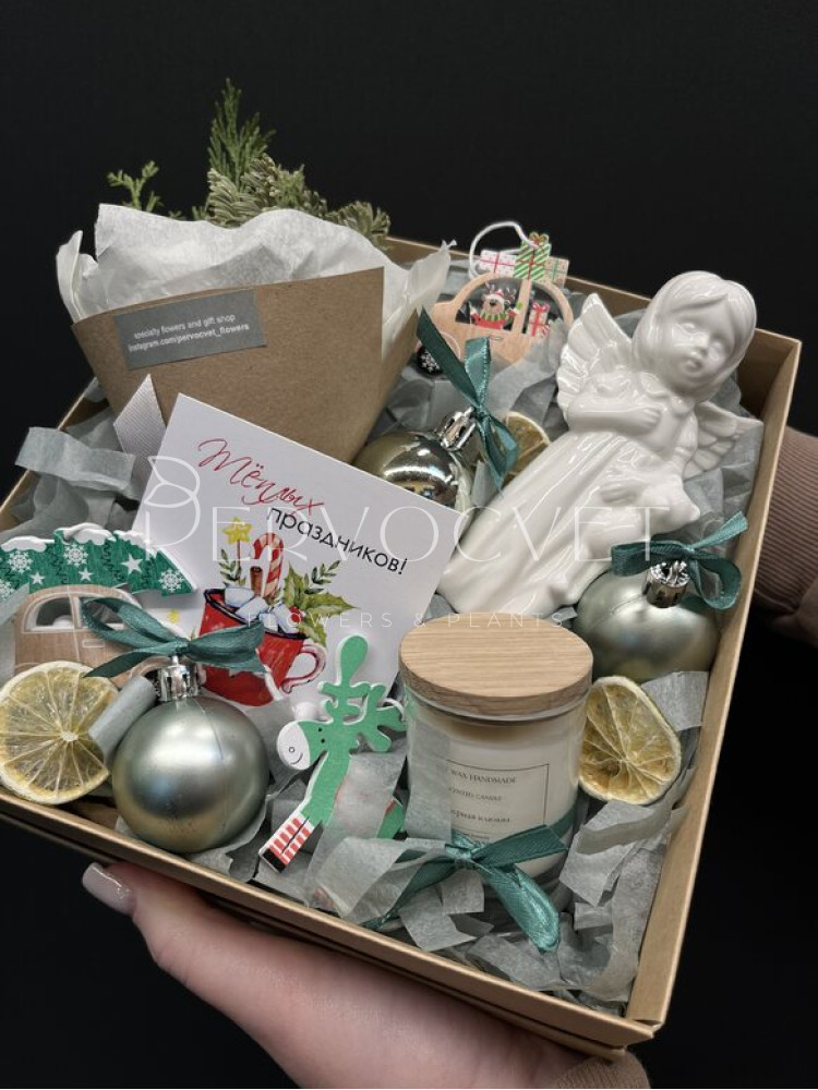Новогодний бокс в подарочном оформлении с букетиком из лапки пихты Нобилис и туи Кониферн с апельсиновой долькой, керамическим ангелочком, натуральной соевой ароматной свечой, декором из шариков и долек лайма, и, конечно, карточкой для Ваших теплых слов!