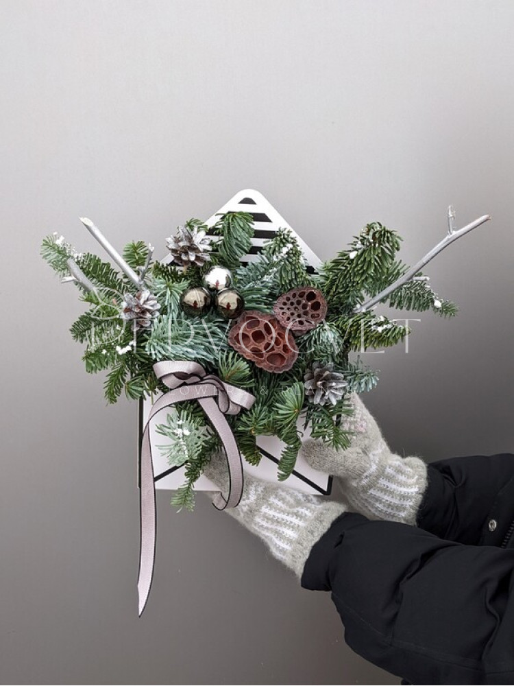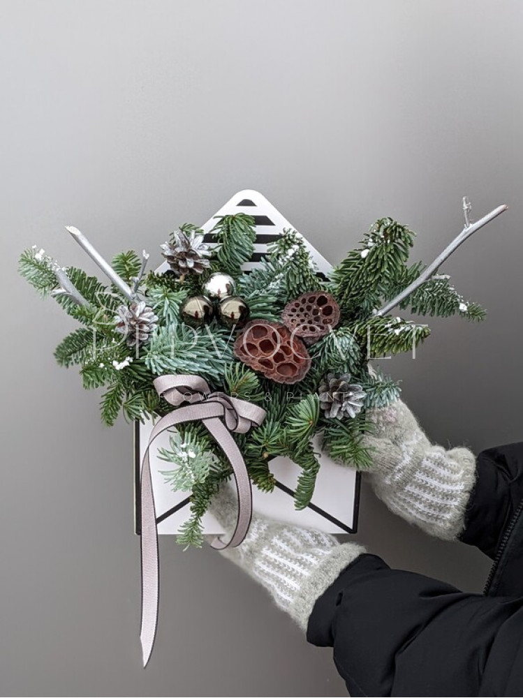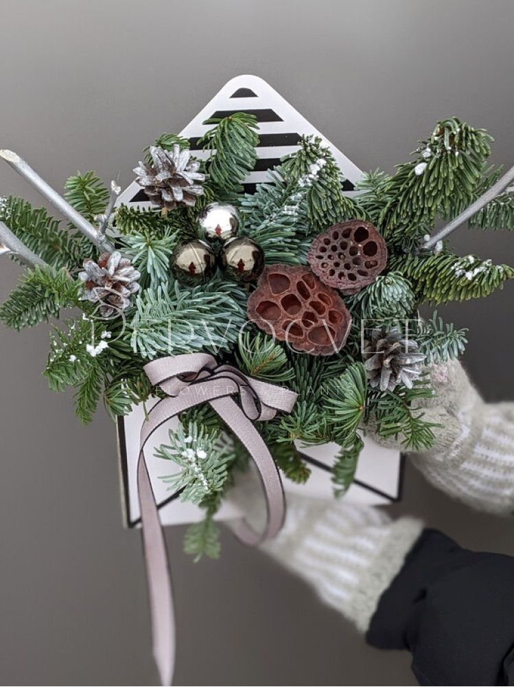 Рождественская композиция в конверте с натуральной пихтой Нобилис и праздничным декором: шишки, лотос, серебряные ветки, елочные игрушки, снег. Идеальный подарок для похода в гости, поздравления близкого человека.