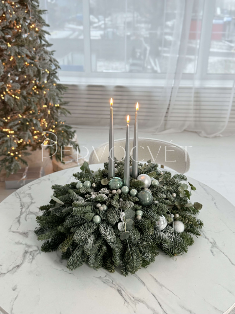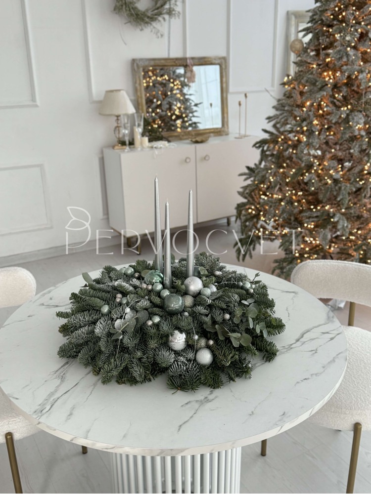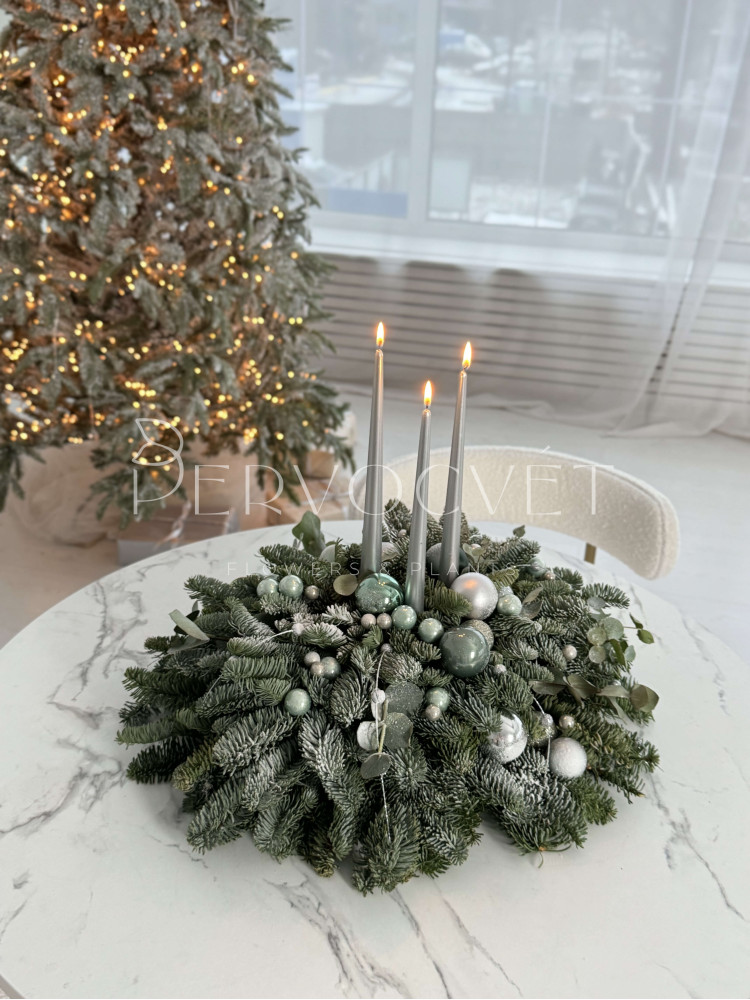 состав: нобилис, шарики, снежные ветки серебро, эвкалипт, свечи 3, искусственный снег