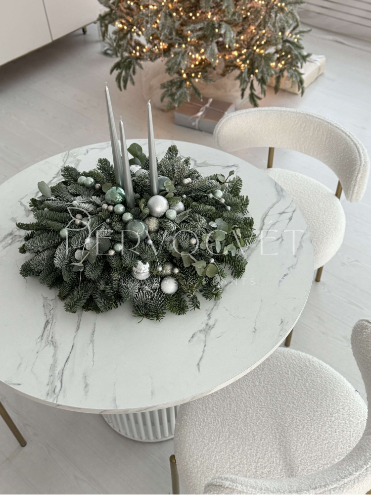 Рождественская (новогодняя) композиция из новой коллекции 2024/25 для украшения праздничного стола, или дополнительный декор пространства. Часть коллекции "Зимний лес", из натуральной пихты нобилис, с шариками в белых, зеленых и серебряных оттенках, с эвкалиптом и восковыми свечами, для создания уюта и праздничного настроения!