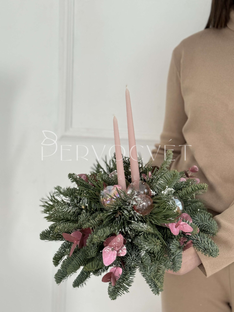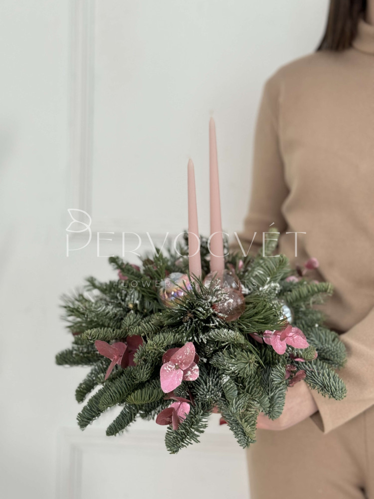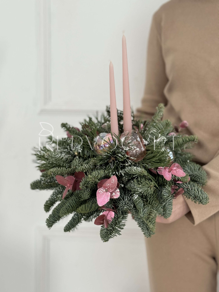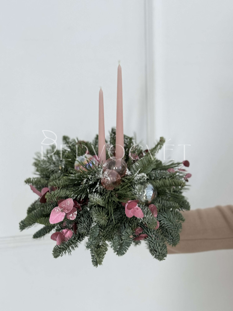 Рождественская (новогодняя) композиция для украшения праздничного стола, или дополнительный декор пространства. Часть розовой коллекции, из натуральной пихты нобилис, с прозрачными розовыми шариками, как мыльные пузыри, ярким эвкалиптом и восковыми свечами, для создания уюта и праздничного настроения!