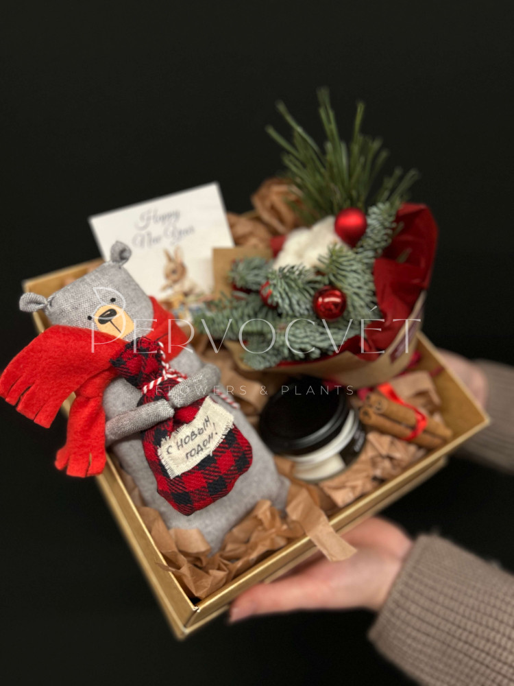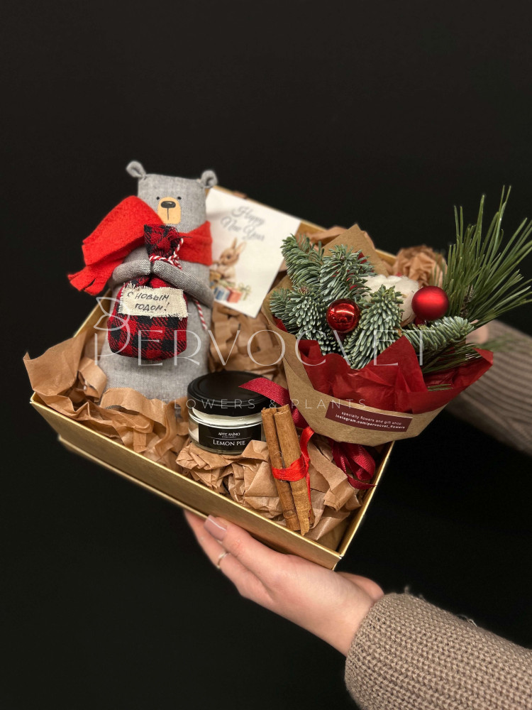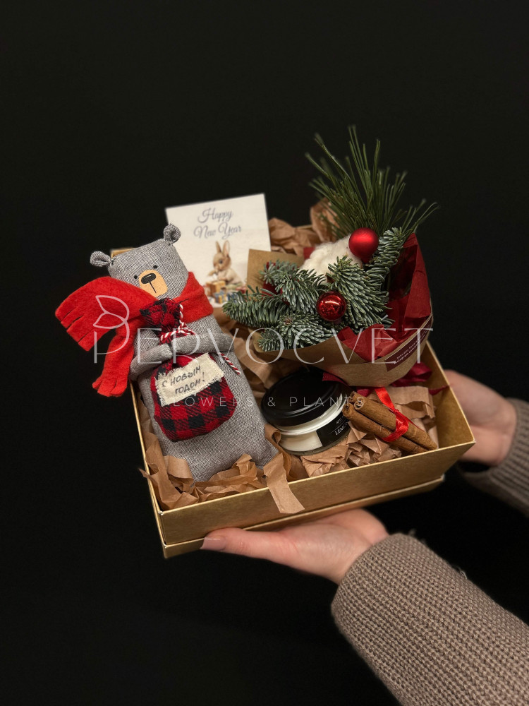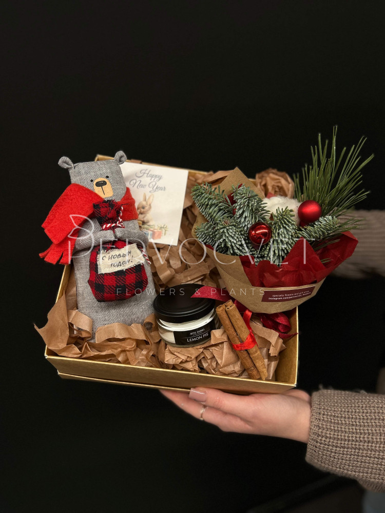 Новогодний бокс: подарочное оформление новогоднего декора в качестве подарка, приятные мелочи для дома с букетиком из лапки пихты Нобилис и туи Кониферн с цветком белого хлопка, льняной игрушкой, натуральной соевой ароматной свечой и палочками корицы, декором из шариков, и, конечно, карточкой для Ваших теплых слов!